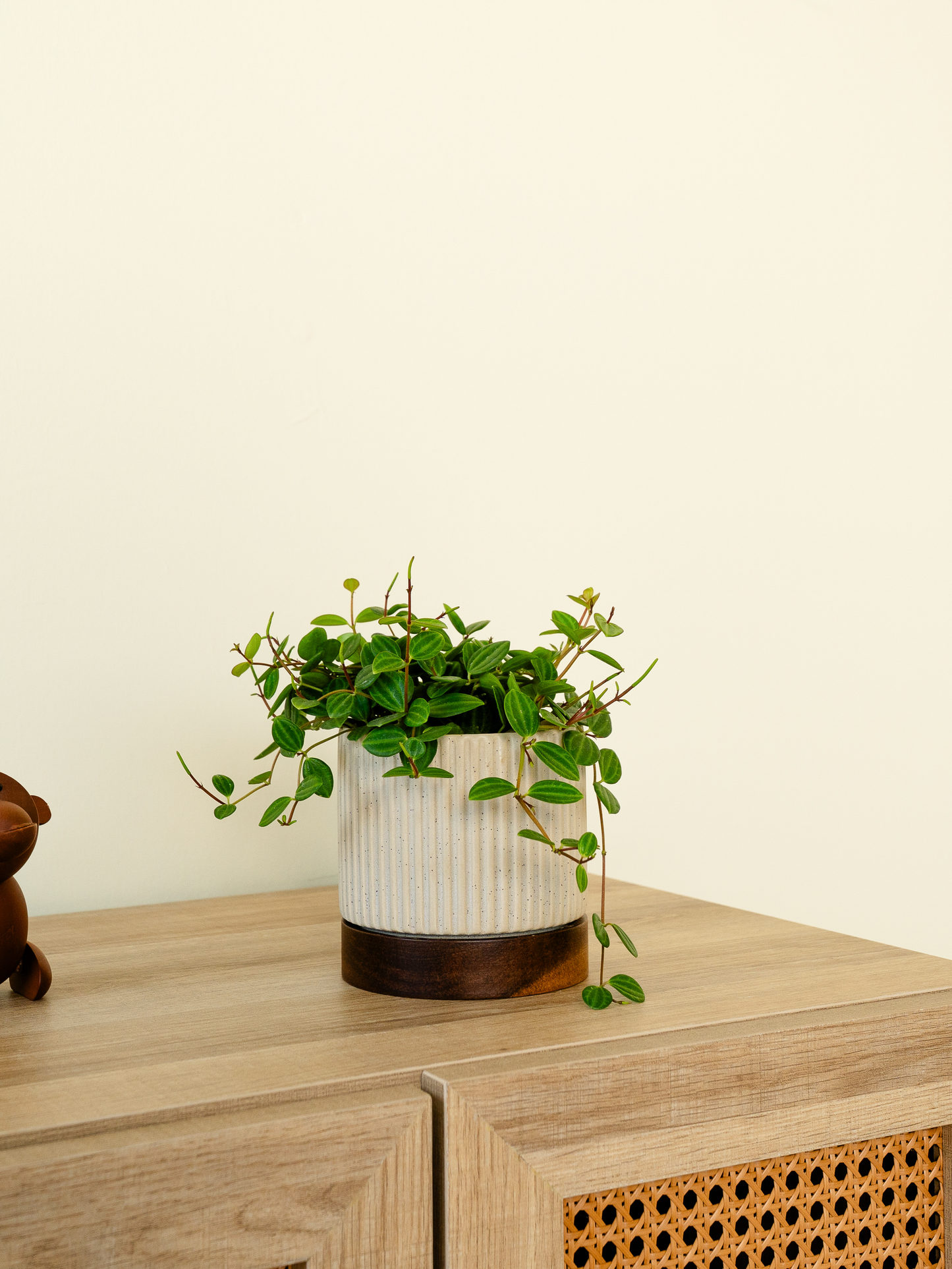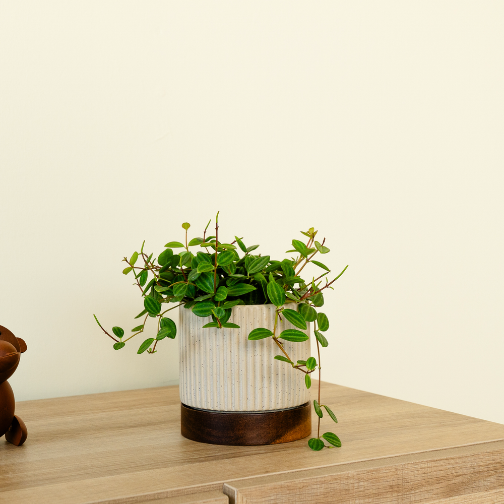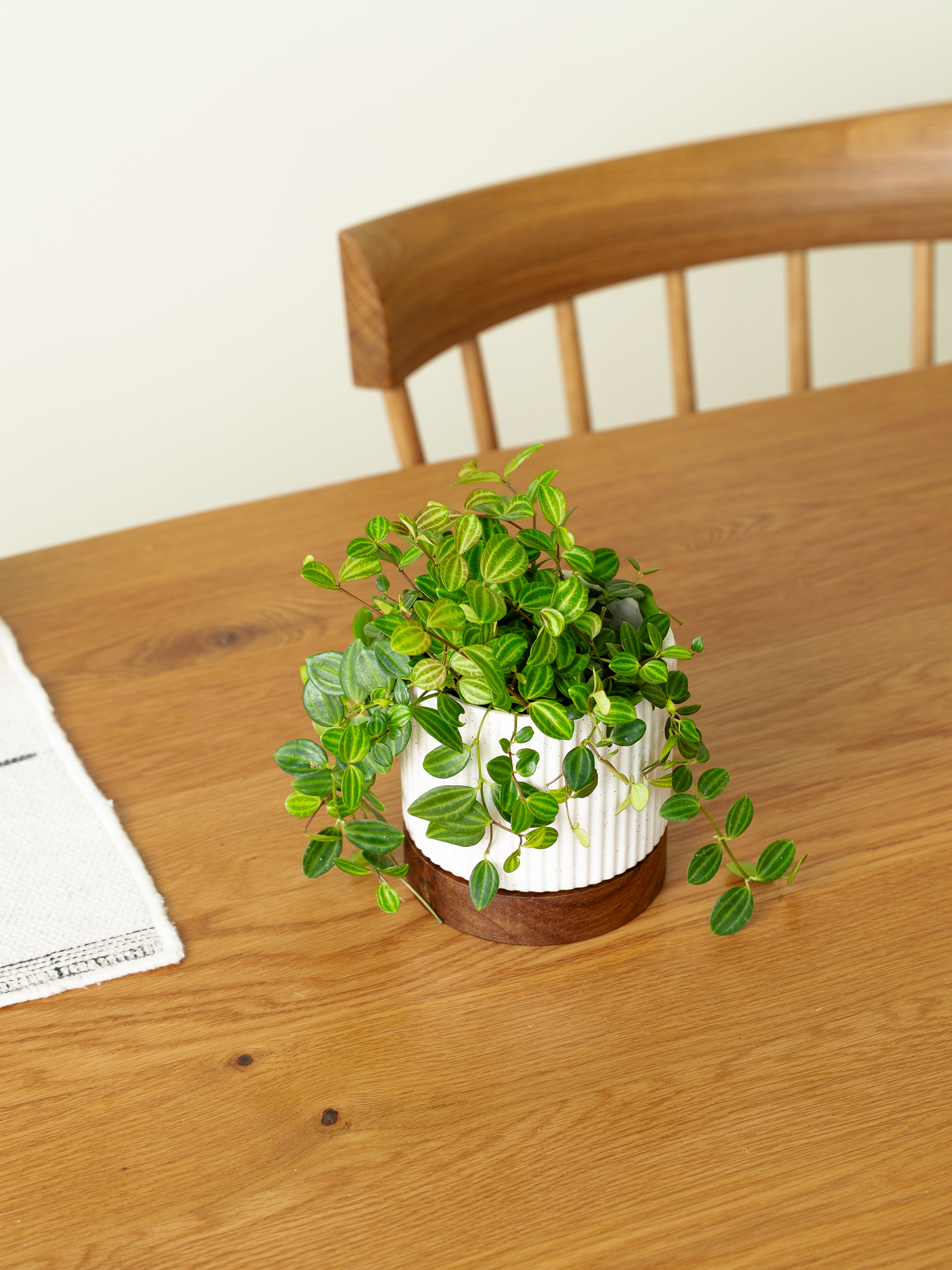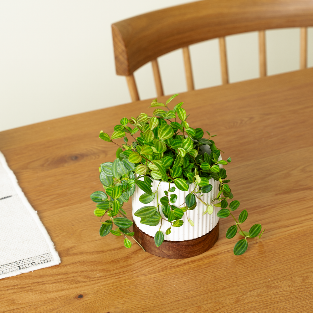 ペペロミアングラータは小さな葉に縞模様が入る可愛らしい小ぶりな観葉植物です。コンパクトなサイズで収まるため、卓上のインテリアとして最適です。
