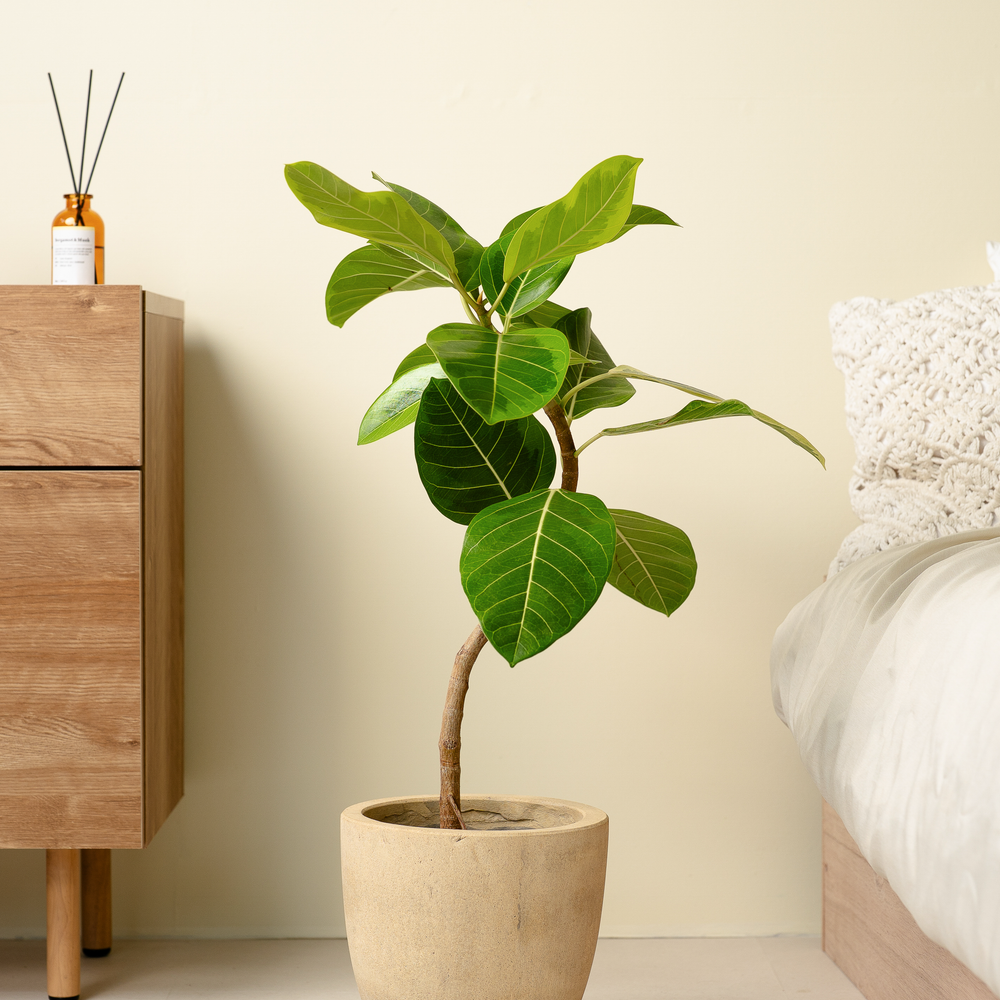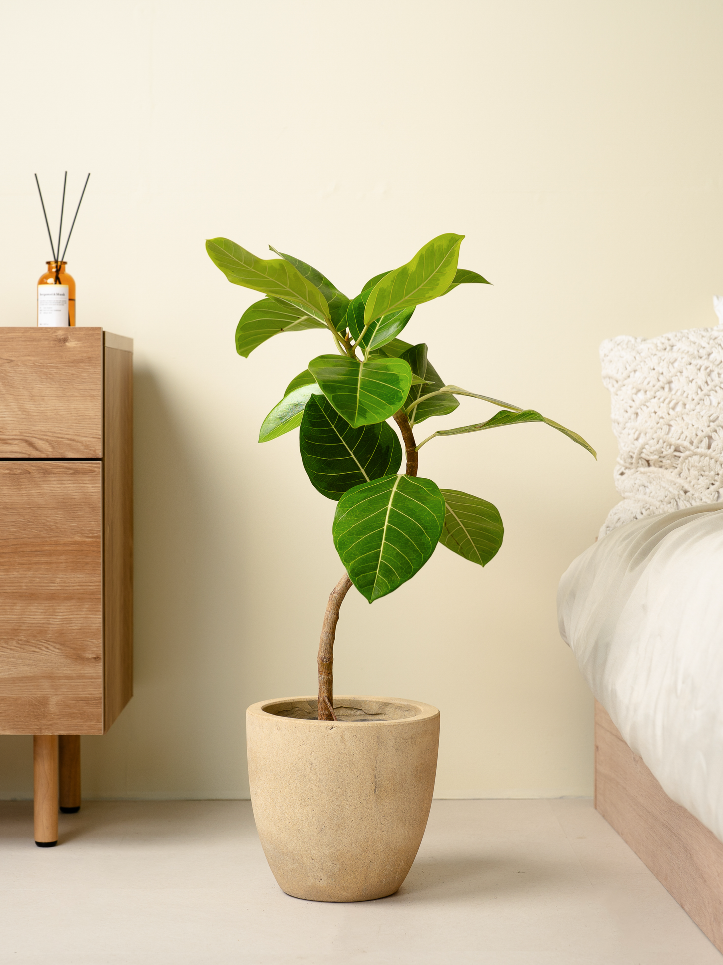 フィカスアルテシーマは、緑と黄色のコントラストが美しい観葉植物です。「永遠の幸せ」という花言葉があるので、ギフトにも最適。葉の色が明るいので、お部屋にアクセントを加えたい、明るい印象にしたいという方におすすめです。