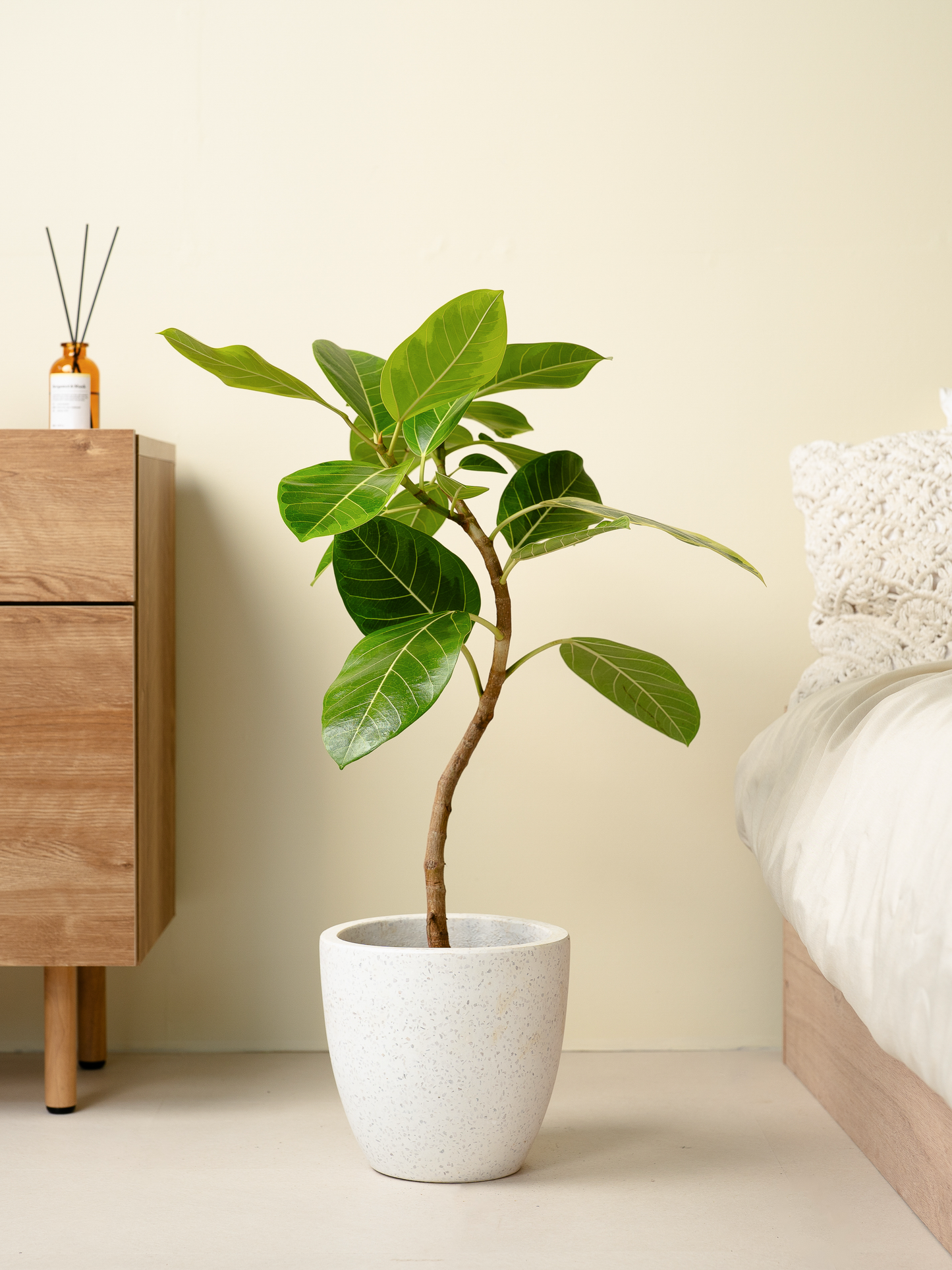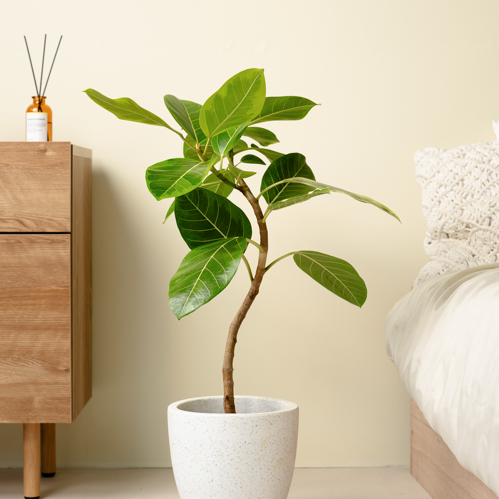 フィカスアルテシーマは、緑と黄色のコントラストが美しい観葉植物です。「永遠の幸せ」という花言葉があるので、ギフトにも最適。葉の色が明るいので、お部屋にアクセントを加えたい、明るい印象にしたいという方におすすめです。