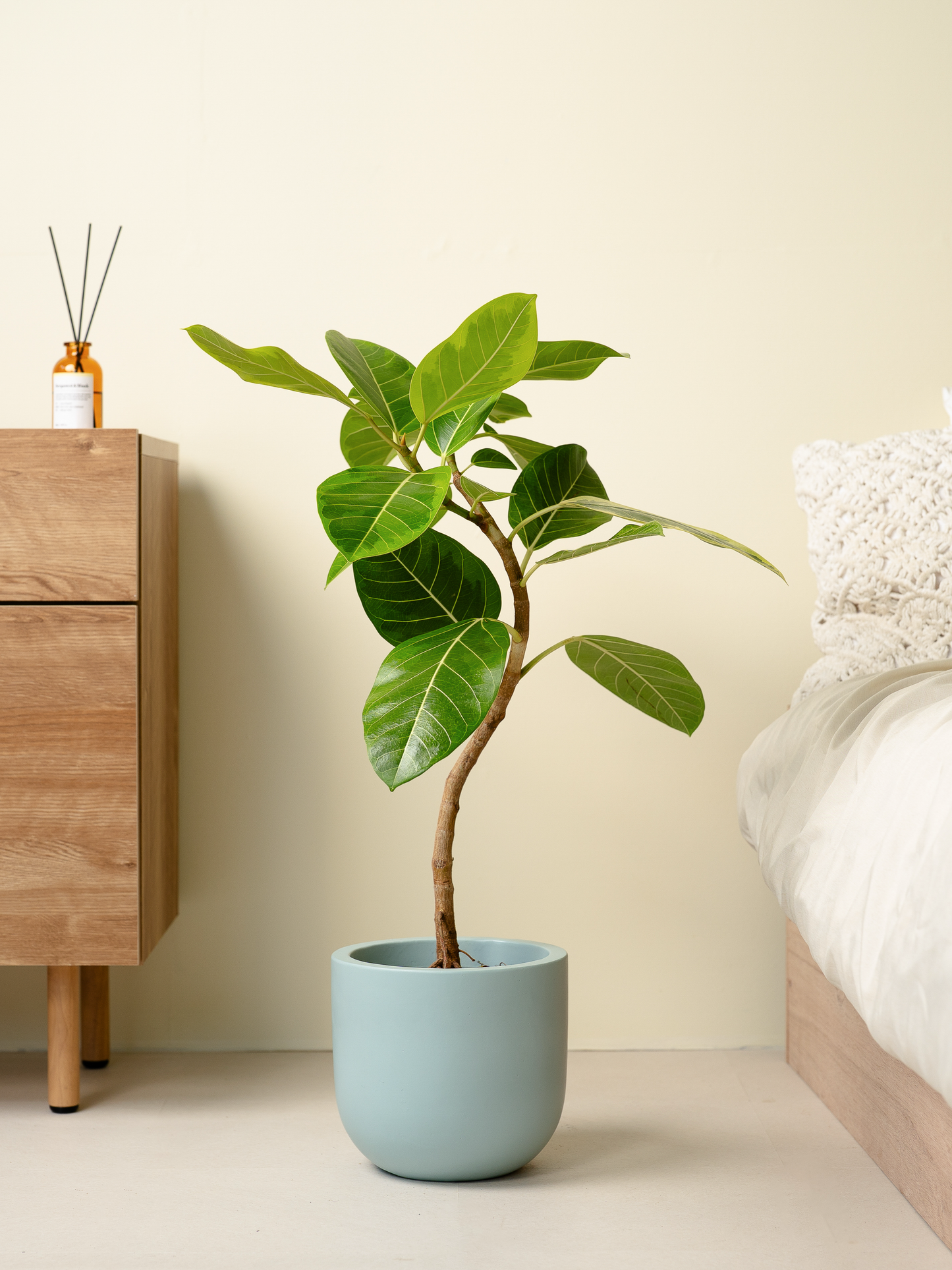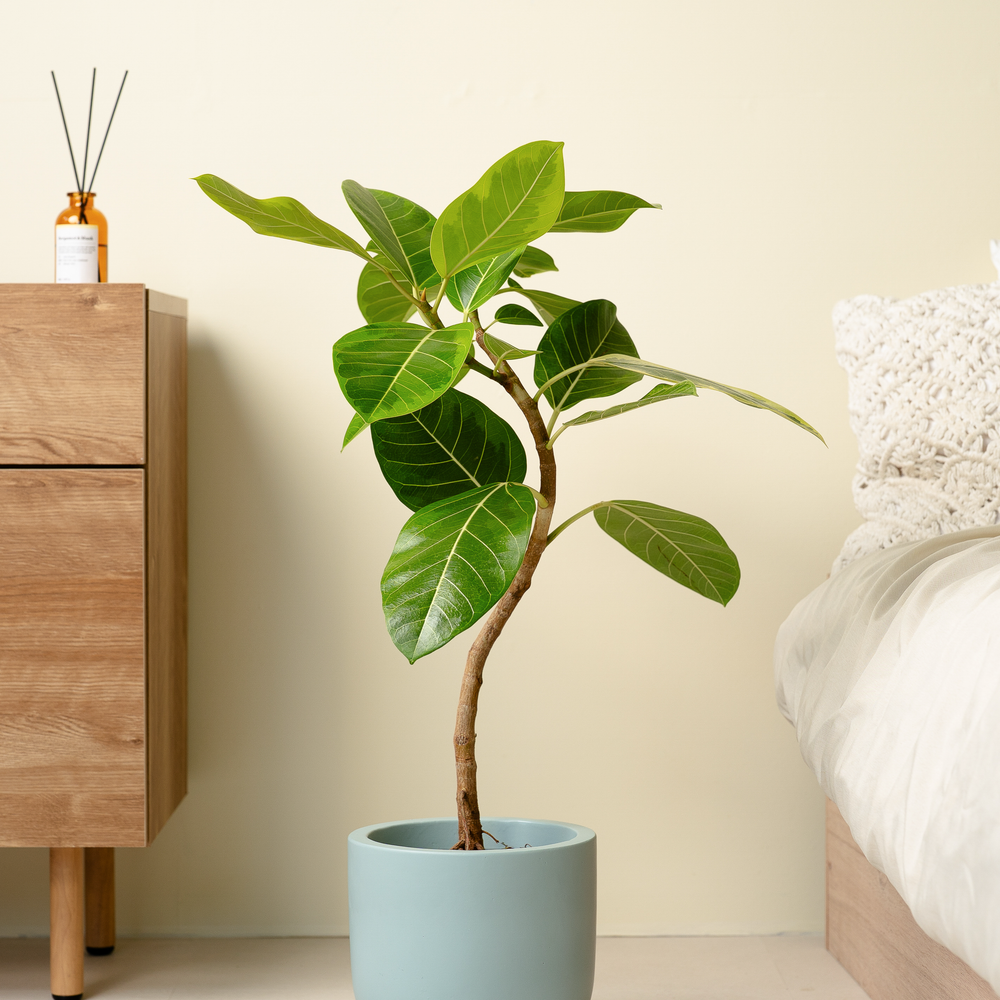 フィカスアルテシーマは、緑と黄色のコントラストが美しい観葉植物です。「永遠の幸せ」という花言葉があるので、ギフトにも最適。葉の色が明るいので、お部屋にアクセントを加えたい、明るい印象にしたいという方におすすめです。