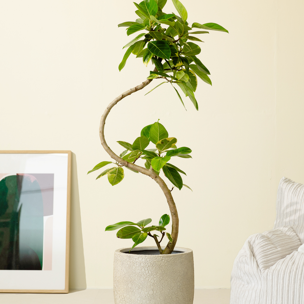 フィカスアルテシーマは、緑と黄色のコントラストが美しい観葉植物です。「永遠の幸せ」という花言葉があるので、ギフトにも最適。葉の色が明るいので、お部屋にアクセントを加えたい、明るい印象にしたいという方におすすめです。
