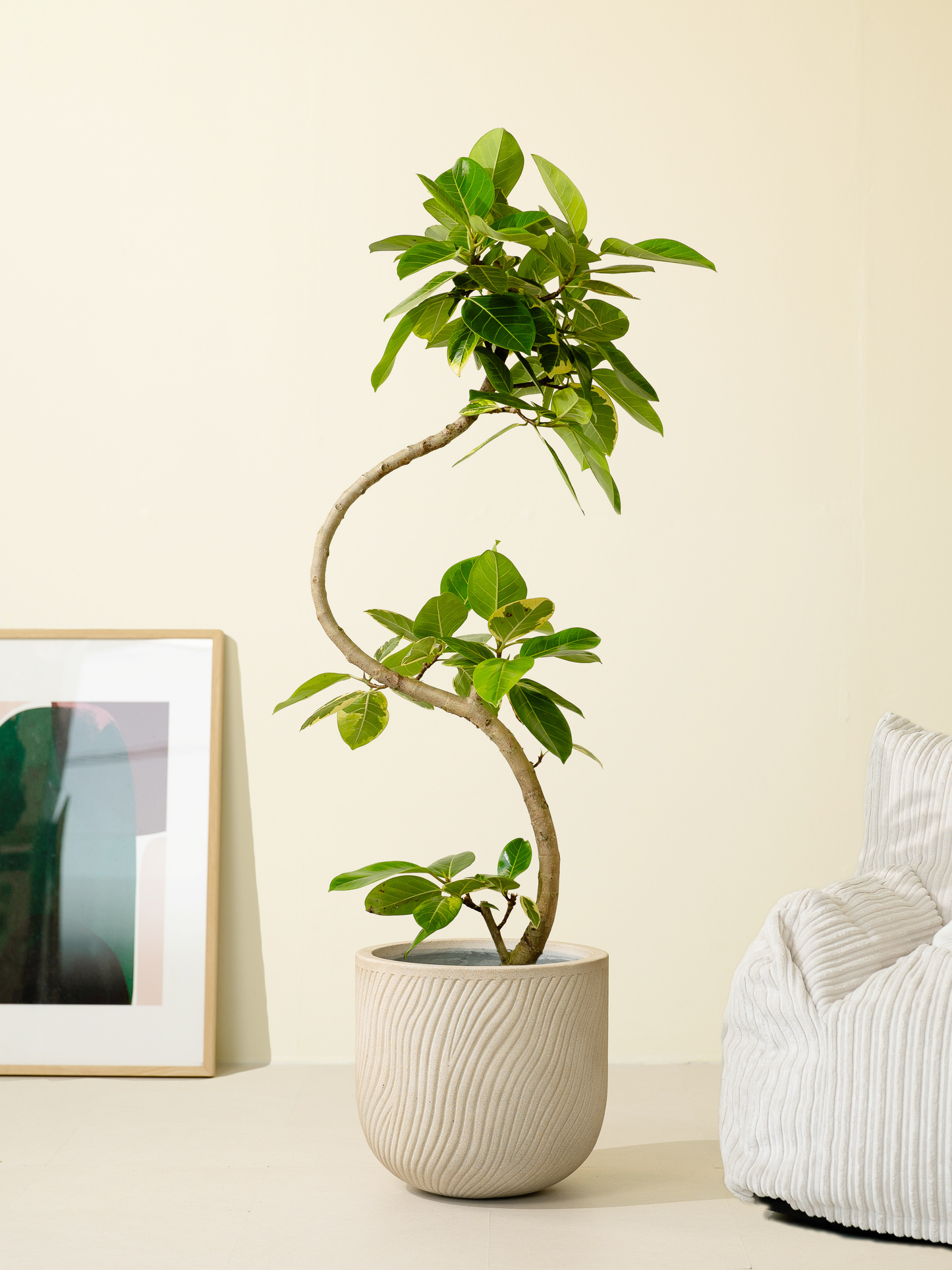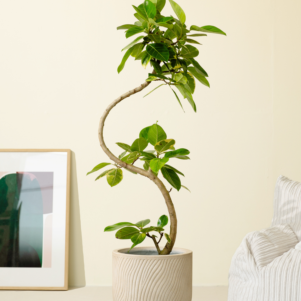フィカスアルテシーマは、緑と黄色のコントラストが美しい観葉植物です。「永遠の幸せ」という花言葉があるので、ギフトにも最適。葉の色が明るいので、お部屋にアクセントを加えたい、明るい印象にしたいという方におすすめです。
