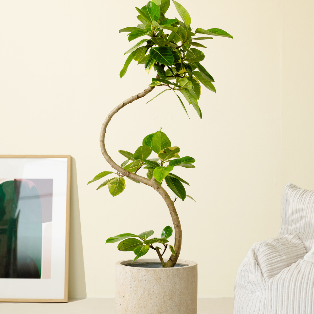フィカスアルテシーマは、緑と黄色のコントラストが美しい観葉植物です。「永遠の幸せ」という花言葉があるので、ギフトにも最適。葉の色が明るいので、お部屋にアクセントを加えたい、明るい印象にしたいという方におすすめです。