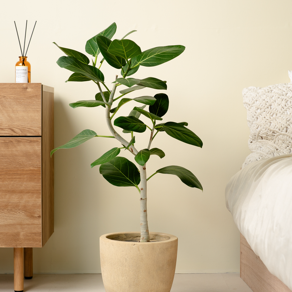 フィカスベンガレンシスは、濃い緑の葉と白い幹のコントラストが美しい観葉植物です。「永遠の幸せ」という花言葉があるので、ギフトに最適です。どんなお部屋にも相性が良く、育てやすいので初心者の方にもおすすめです。