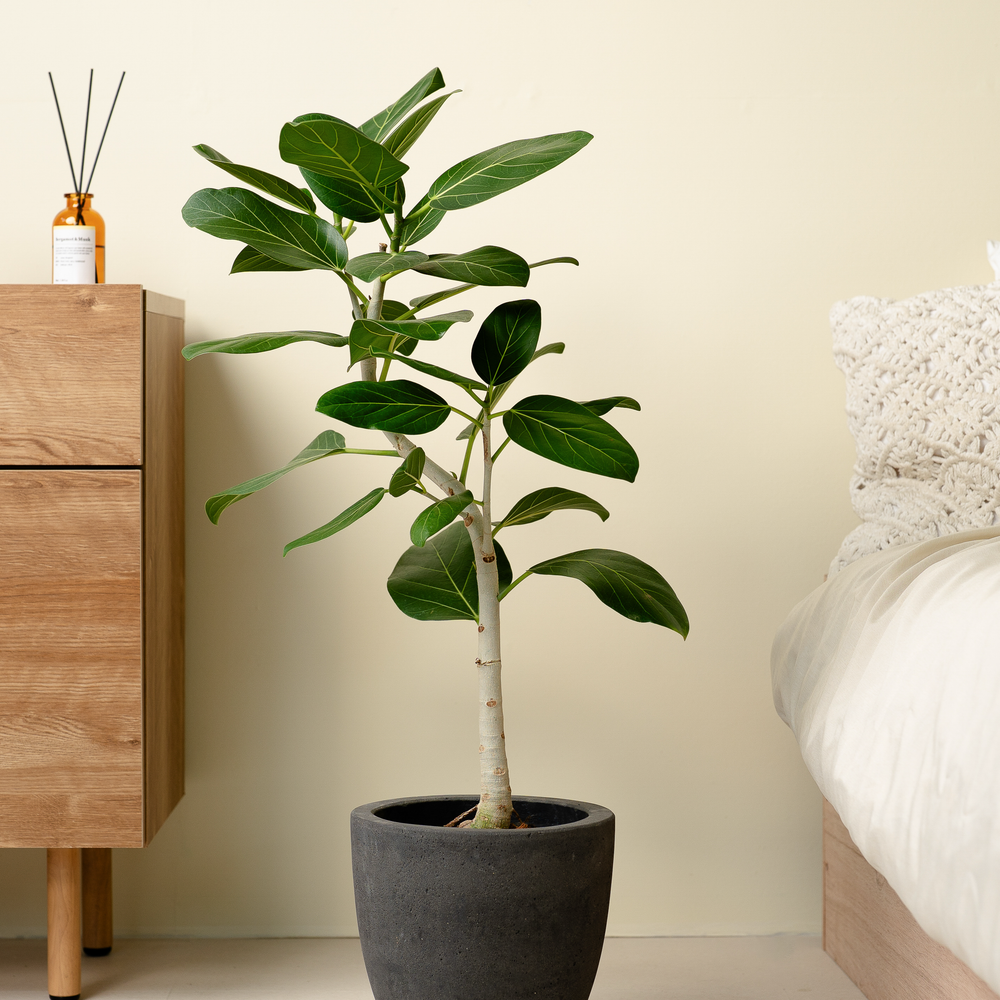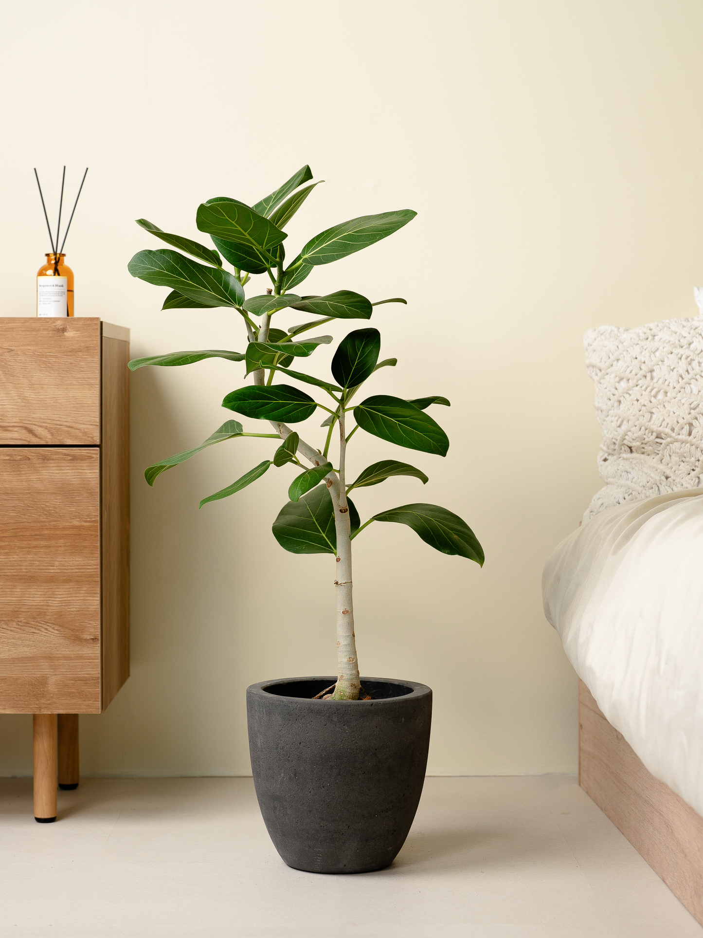フィカスベンガレンシスは、濃い緑の葉と白い幹のコントラストが美しい観葉植物です。「永遠の幸せ」という花言葉があるので、ギフトに最適です。どんなお部屋にも相性が良く、育てやすいので初心者の方にもおすすめです。