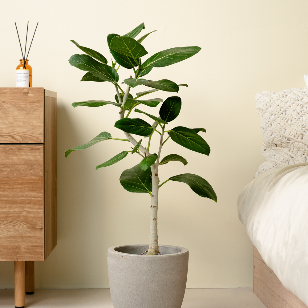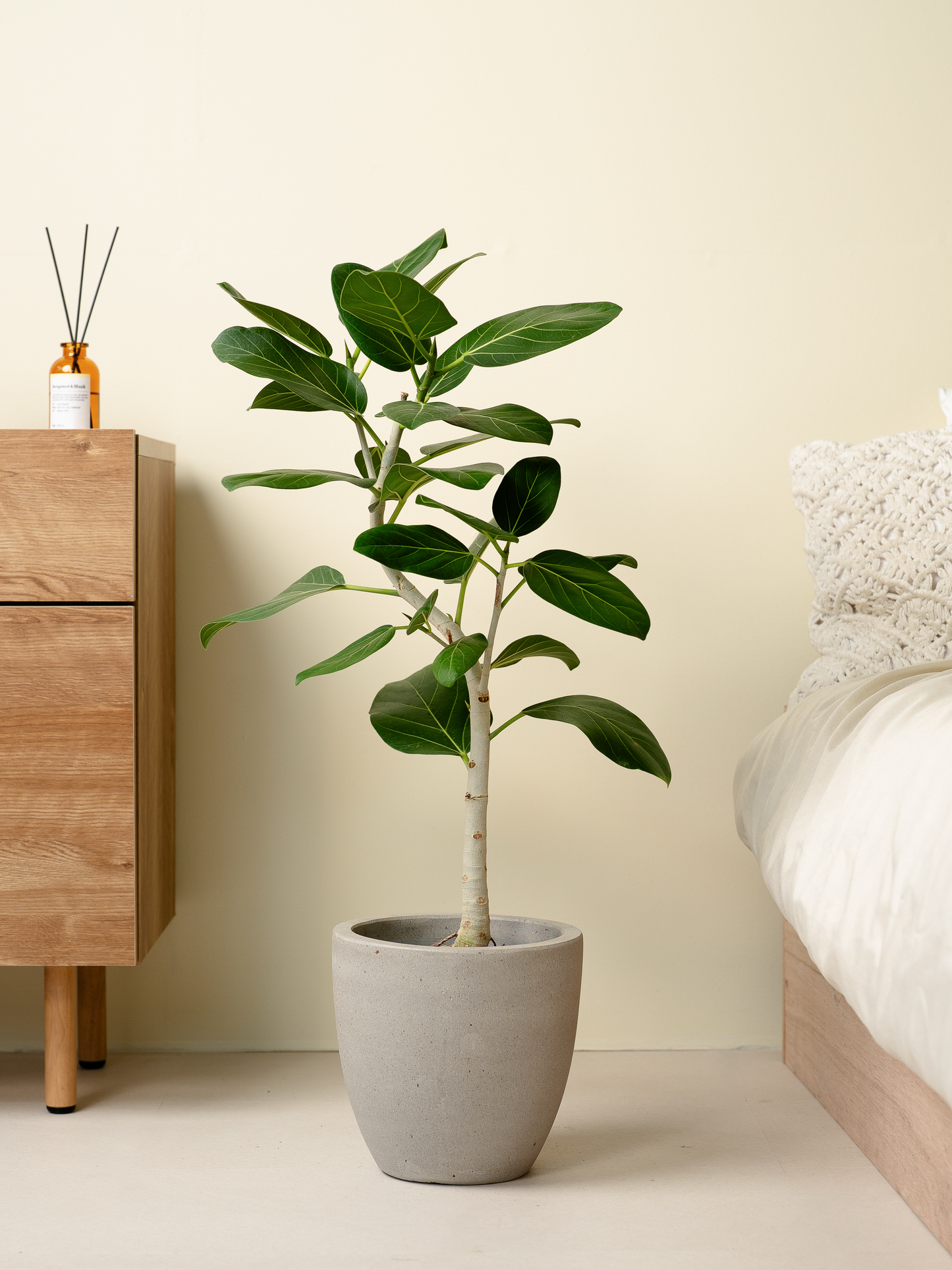 フィカスベンガレンシスは、濃い緑の葉と白い幹のコントラストが美しい観葉植物です。「永遠の幸せ」という花言葉があるので、ギフトに最適です。どんなお部屋にも相性が良く、育てやすいので初心者の方にもおすすめです。