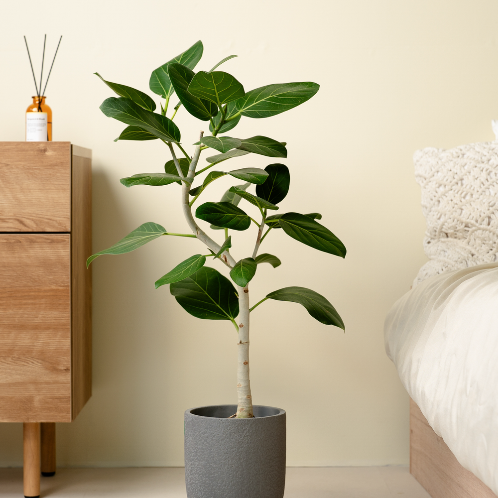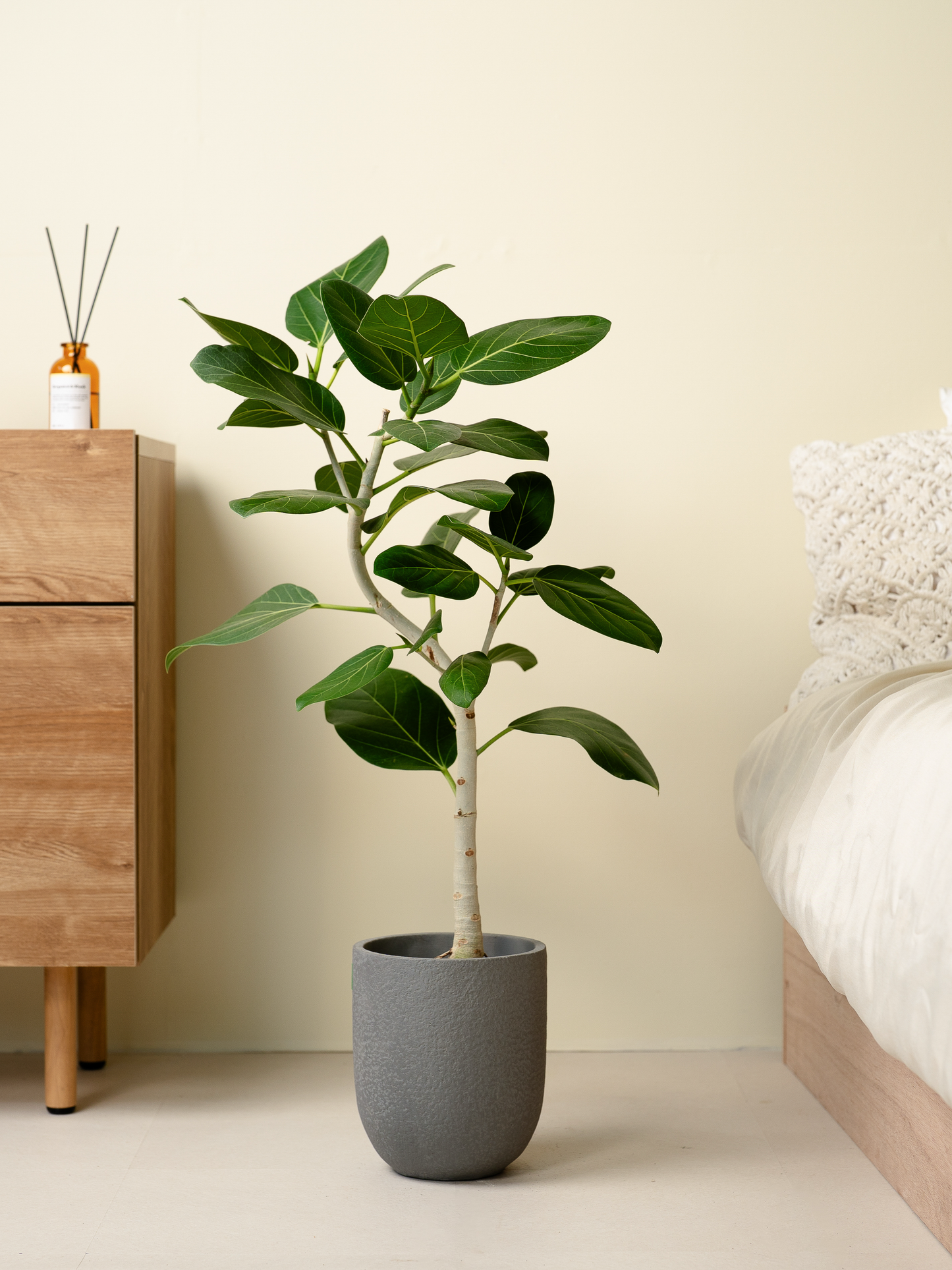 フィカスベンガレンシスは、濃い緑の葉と白い幹のコントラストが美しい観葉植物です。「永遠の幸せ」という花言葉があるので、ギフトに最適です。どんなお部屋にも相性が良く、育てやすいので初心者の方にもおすすめです。