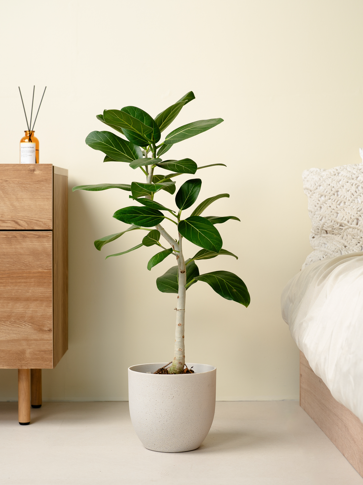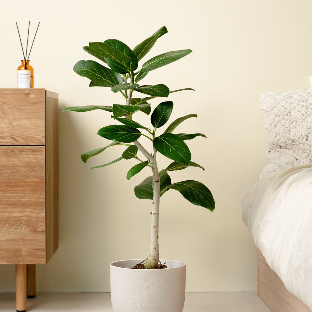 フィカスベンガレンシスは、濃い緑の葉と白い幹のコントラストが美しい観葉植物です。「永遠の幸せ」という花言葉があるので、ギフトに最適です。どんなお部屋にも相性が良く、育てやすいので初心者の方にもおすすめです。