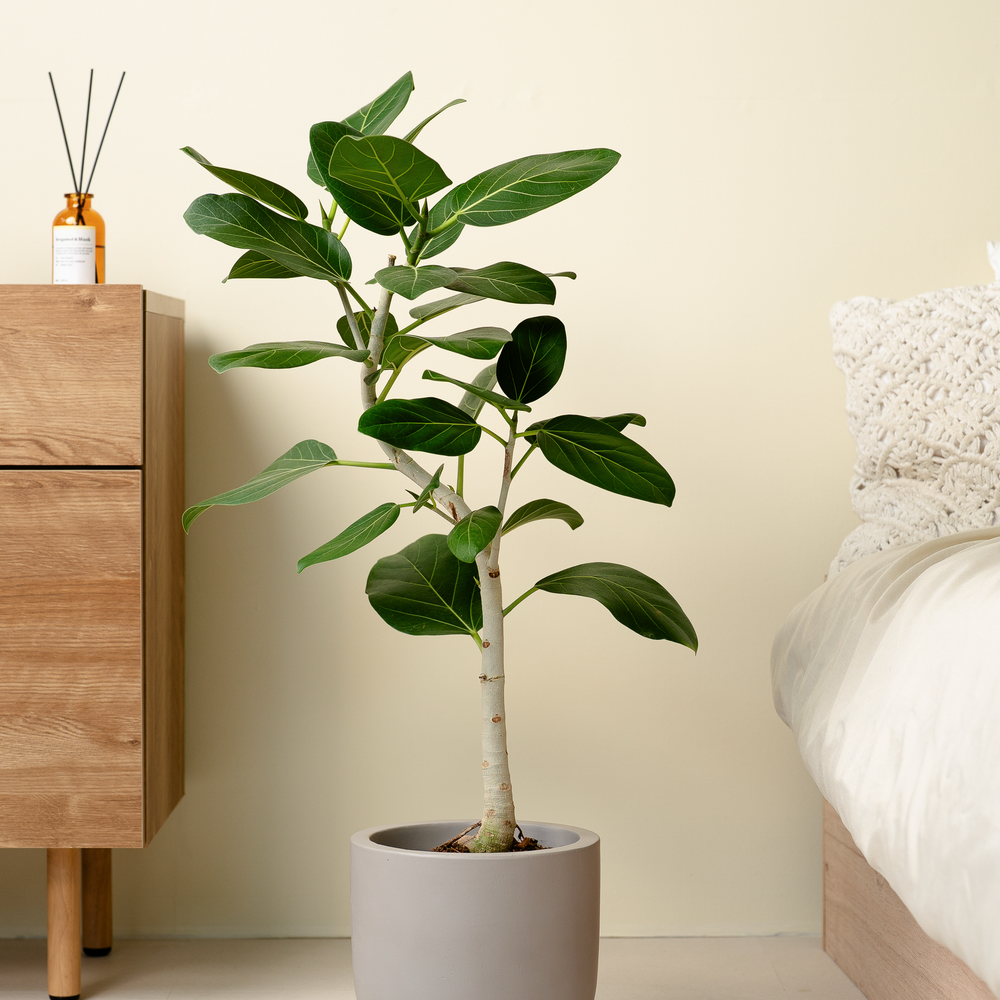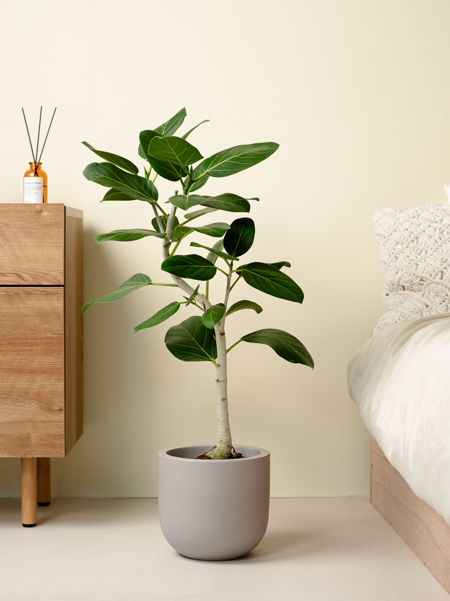 フィカスベンガレンシスは、濃い緑の葉と白い幹のコントラストが美しい観葉植物です。「永遠の幸せ」という花言葉があるので、ギフトに最適です。どんなお部屋にも相性が良く、育てやすいので初心者の方にもおすすめです。