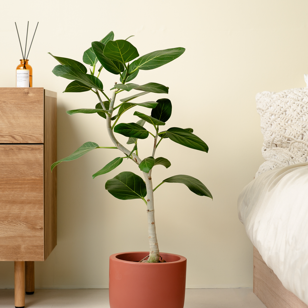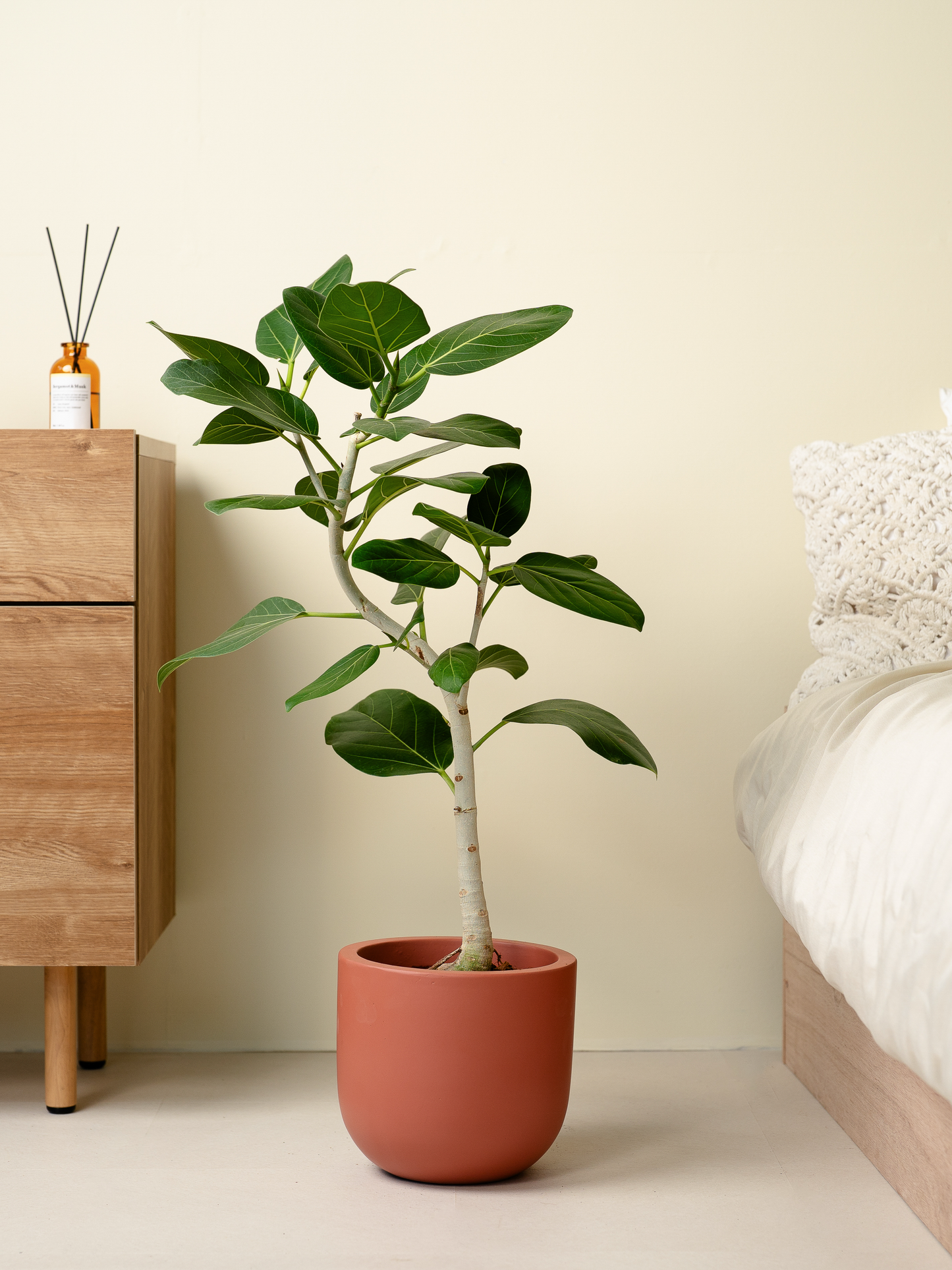 フィカスベンガレンシスは、濃い緑の葉と白い幹のコントラストが美しい観葉植物です。「永遠の幸せ」という花言葉があるので、ギフトに最適です。どんなお部屋にも相性が良く、育てやすいので初心者の方にもおすすめです。