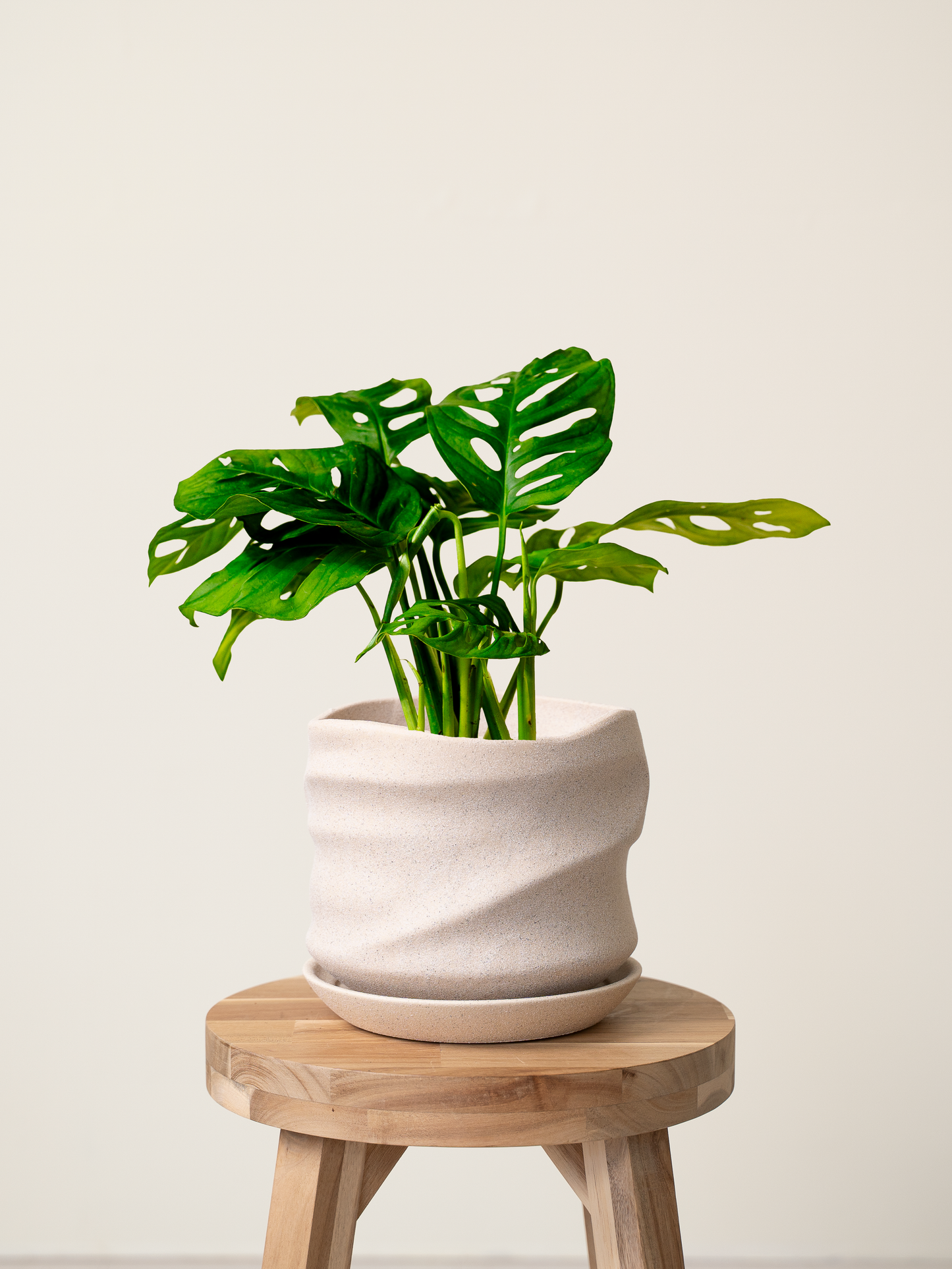 マドカズラは、穴の空いた葉が特徴的な観葉植物です。茎が伸びて垂れ下がる特性があるため、シェルフなど高さのある場所に置くことをおすすめします。