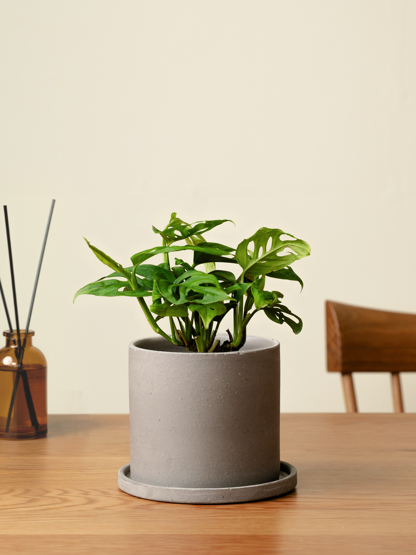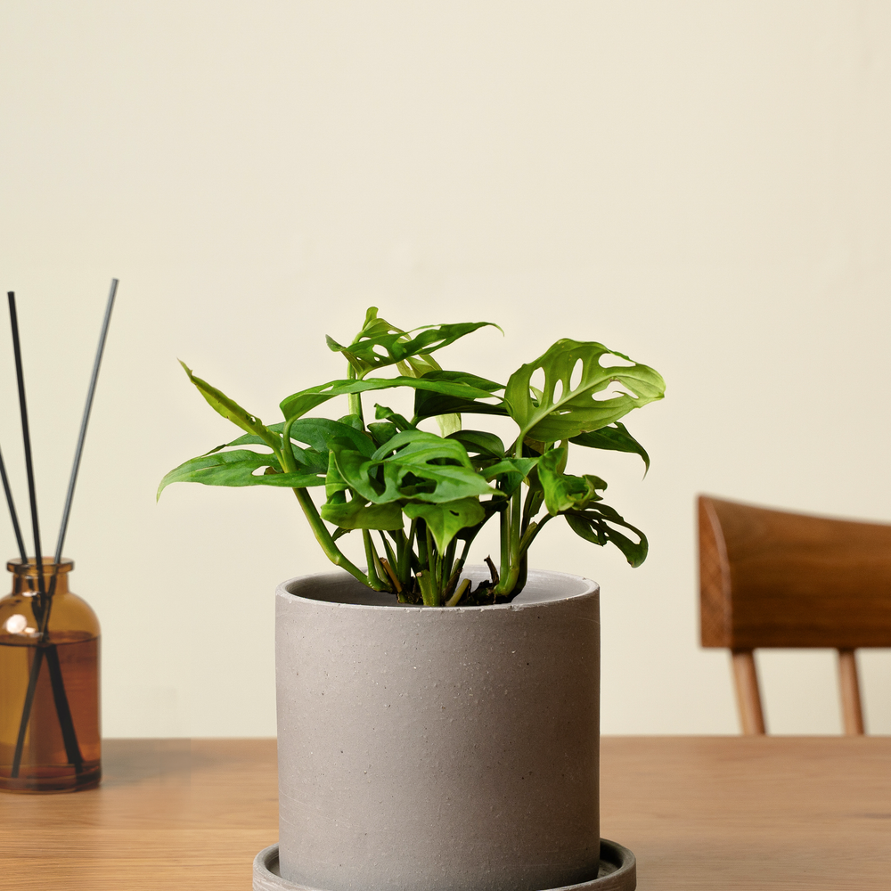マドカズラは、穴の空いた葉が特徴的な観葉植物です。茎が伸びて垂れ下がる特性があるため、シェルフなど高さのある場所に置くことをおすすめします。