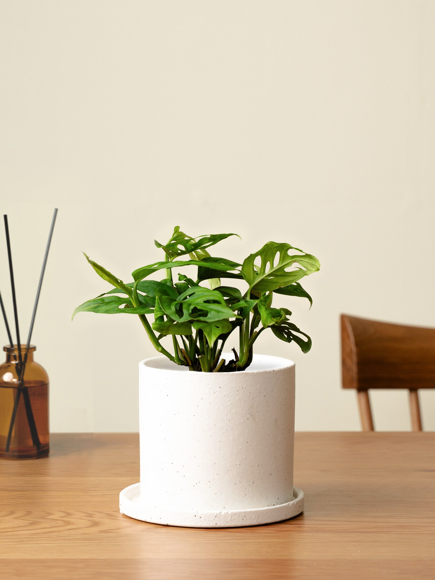 マドカズラは、穴の空いた葉が特徴的な観葉植物です。茎が伸びて垂れ下がる特性があるため、シェルフなど高さのある場所に置くことをおすすめします。