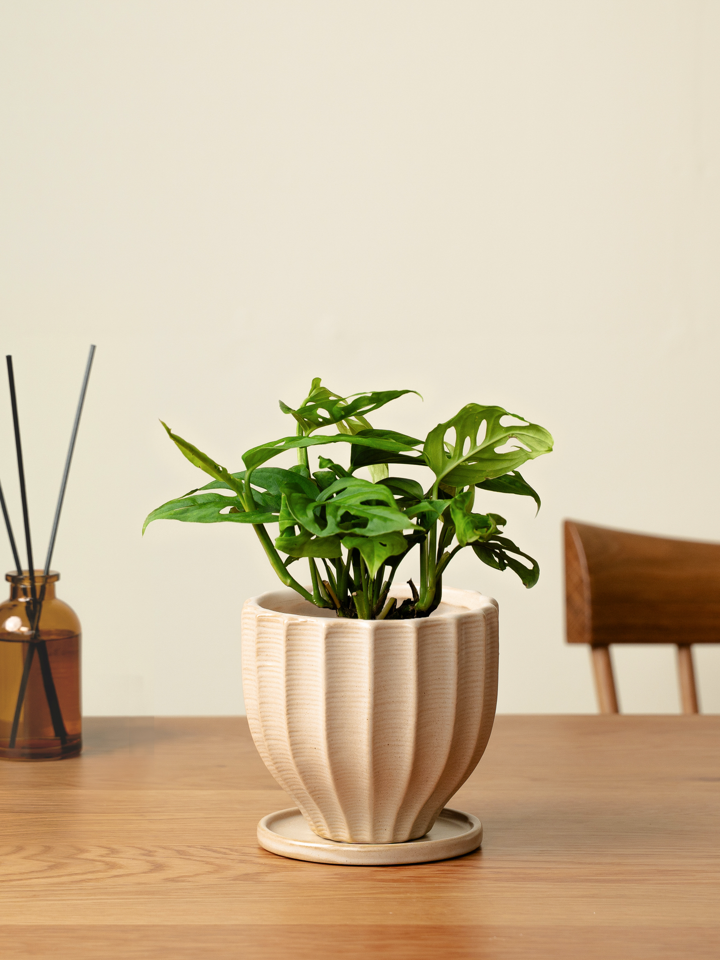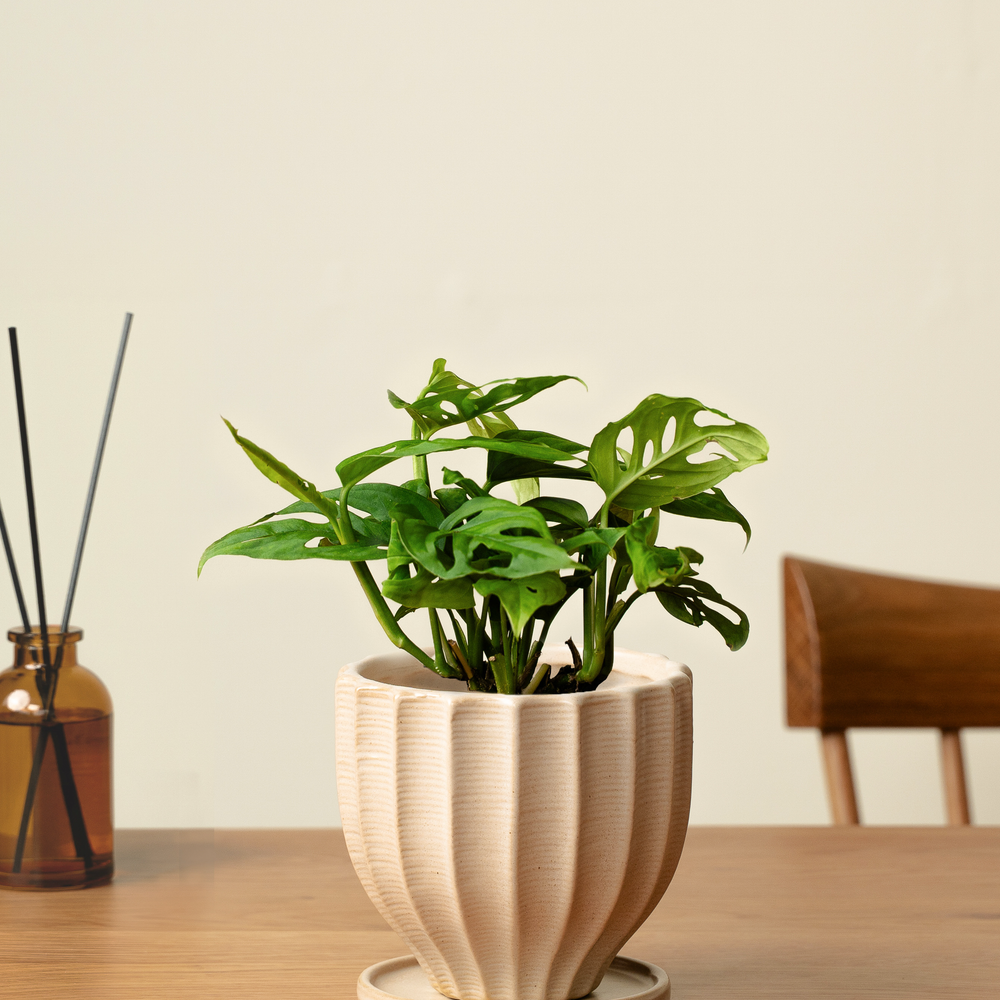 マドカズラは、穴の空いた葉が特徴的な観葉植物です。茎が伸びて垂れ下がる特性があるため、シェルフなど高さのある場所に置くことをおすすめします。