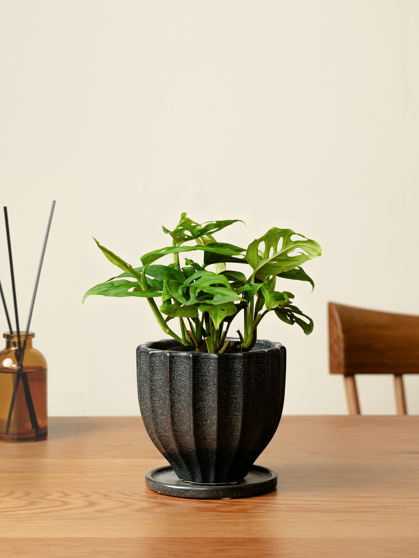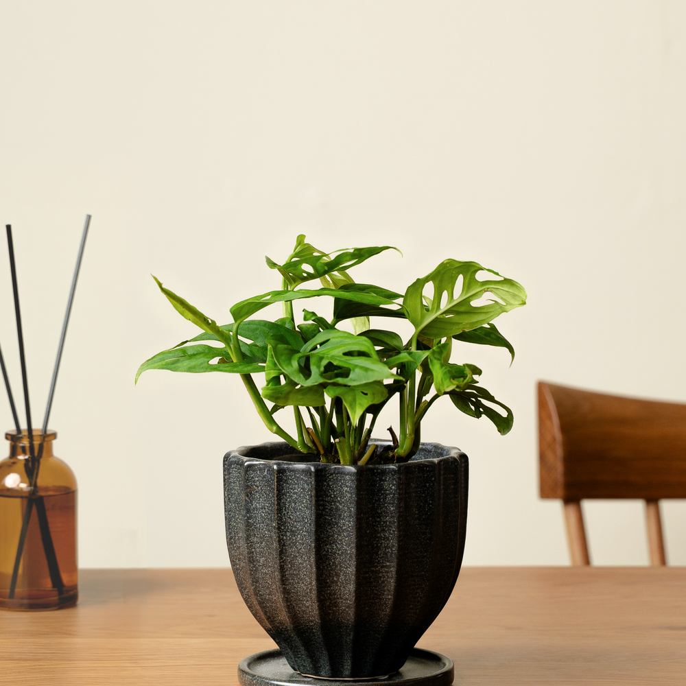 マドカズラは、穴の空いた葉が特徴的な観葉植物です。茎が伸びて垂れ下がる特性があるため、シェルフなど高さのある場所に置くことをおすすめします。