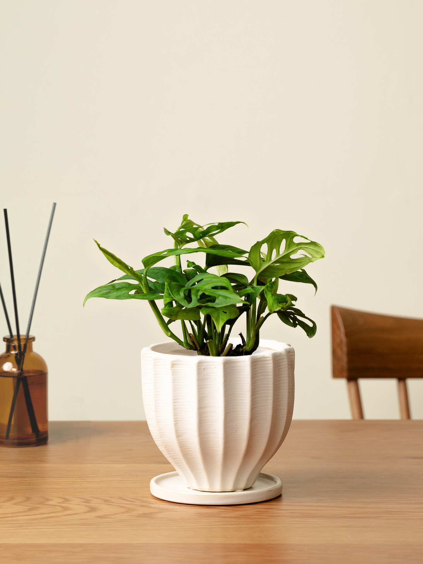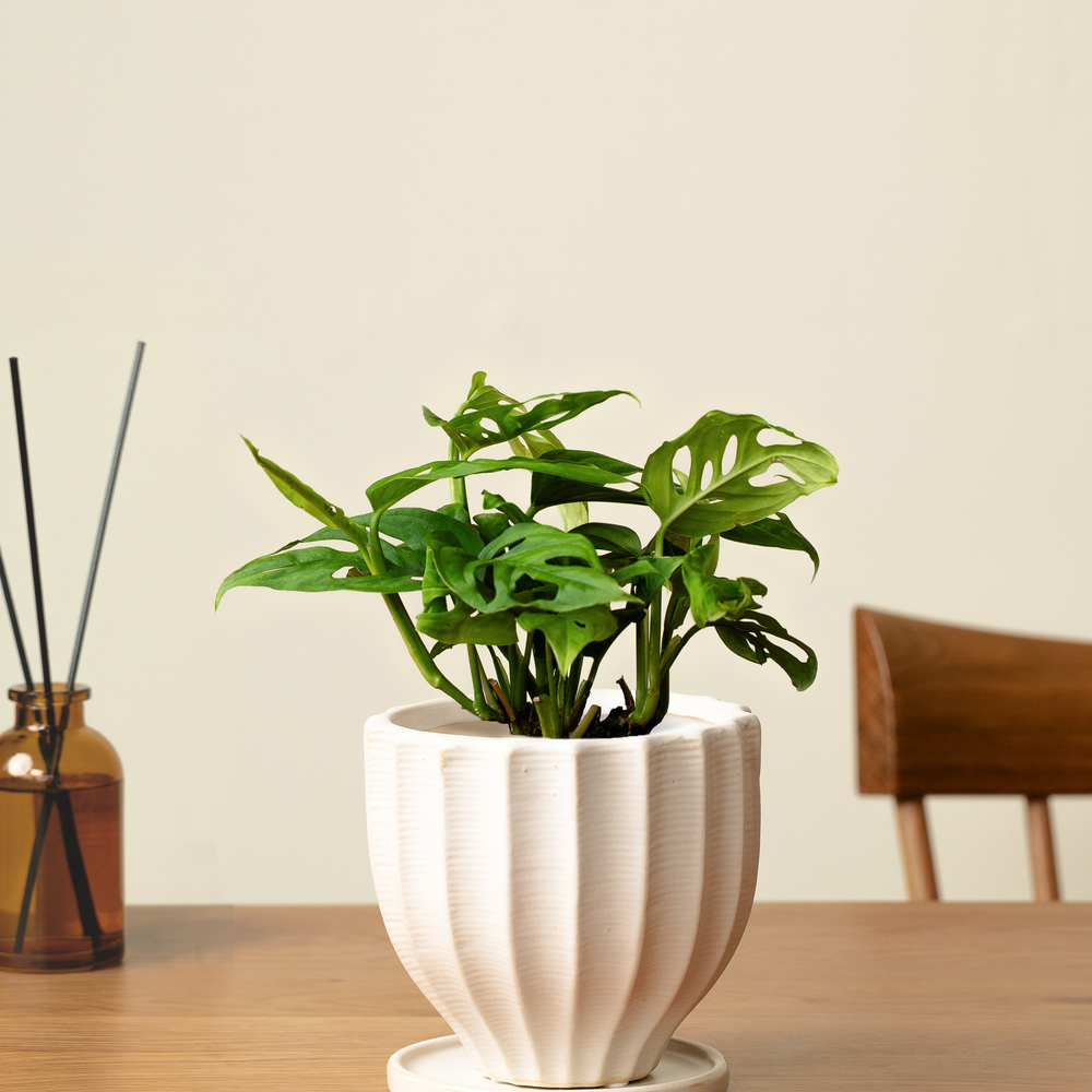 マドカズラは、穴の空いた葉が特徴的な観葉植物です。茎が伸びて垂れ下がる特性があるため、シェルフなど高さのある場所に置くことをおすすめします。