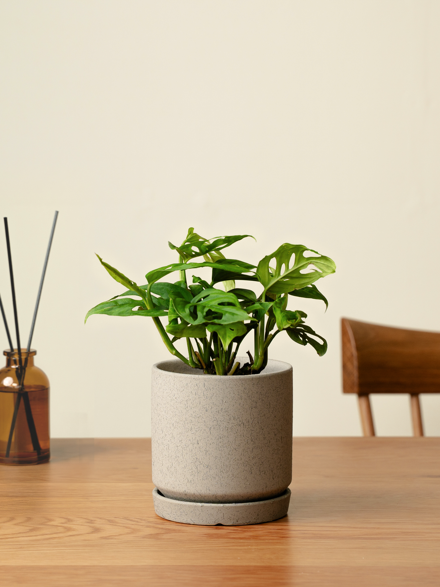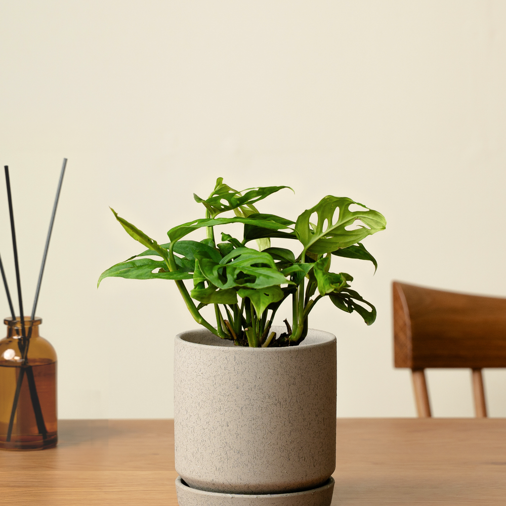 マドカズラは、穴の空いた葉が特徴的な観葉植物です。茎が伸びて垂れ下がる特性があるため、シェルフなど高さのある場所に置くことをおすすめします。