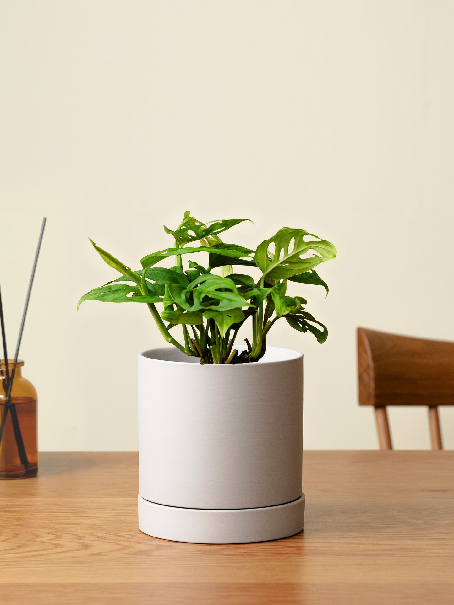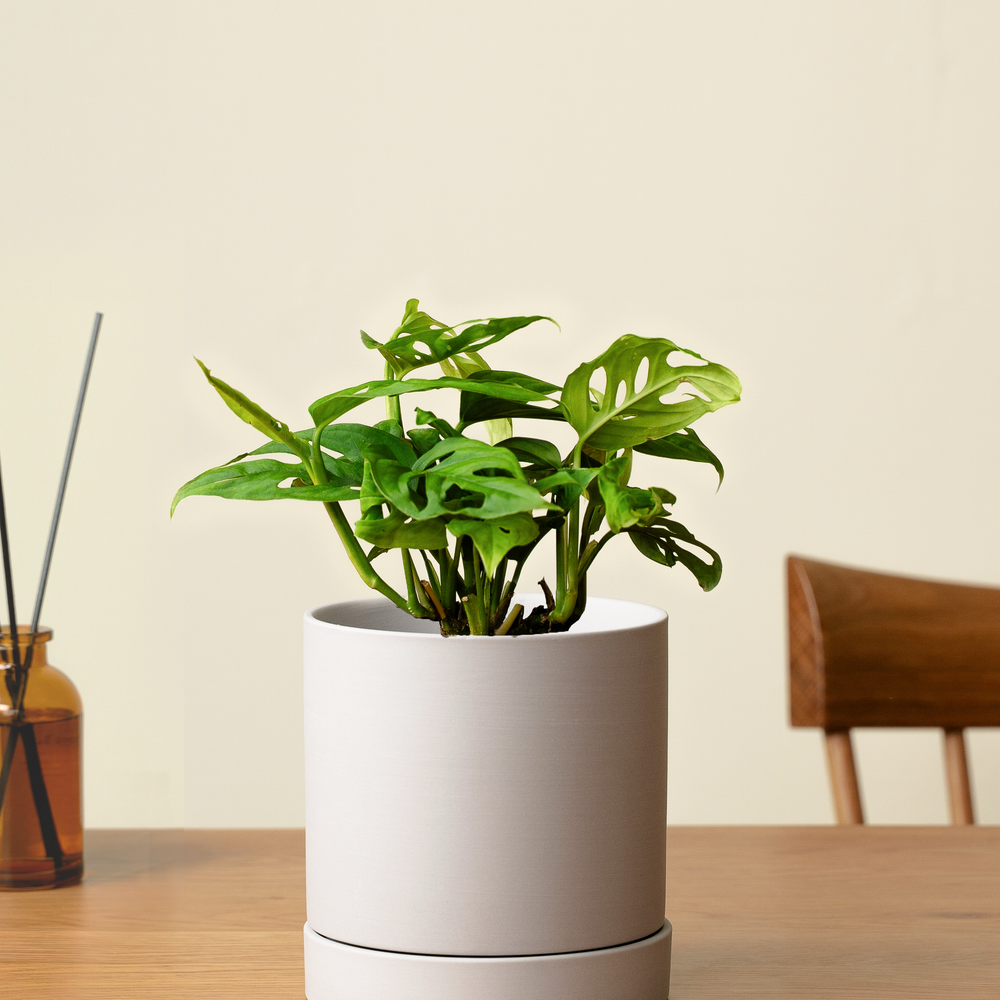 マドカズラは、穴の空いた葉が特徴的な観葉植物です。茎が伸びて垂れ下がる特性があるため、シェルフなど高さのある場所に置くことをおすすめします。