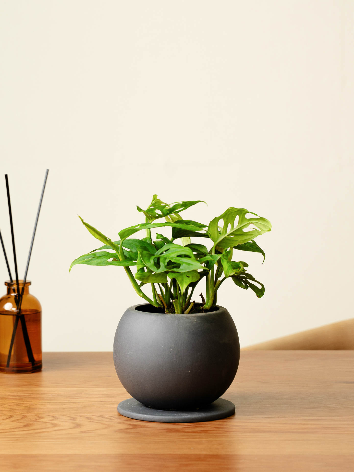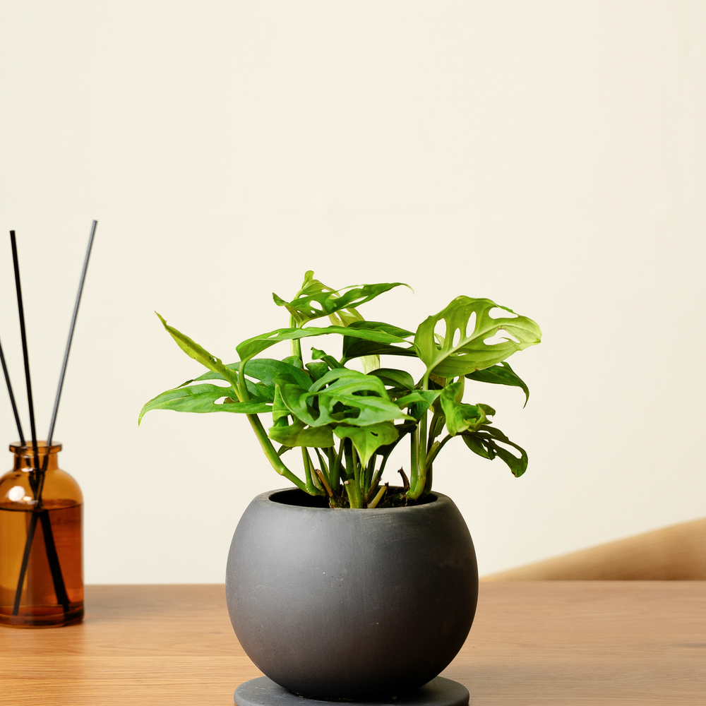 マドカズラは、穴の空いた葉が特徴的な観葉植物です。茎が伸びて垂れ下がる特性があるため、シェルフなど高さのある場所に置くことをおすすめします。