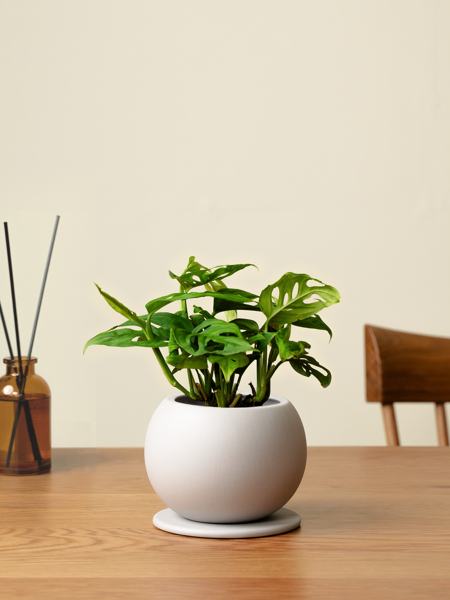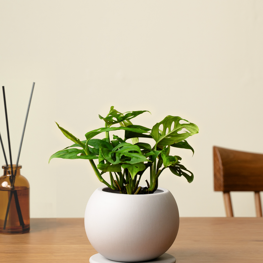 マドカズラは、穴の空いた葉が特徴的な観葉植物です。茎が伸びて垂れ下がる特性があるため、シェルフなど高さのある場所に置くことをおすすめします。