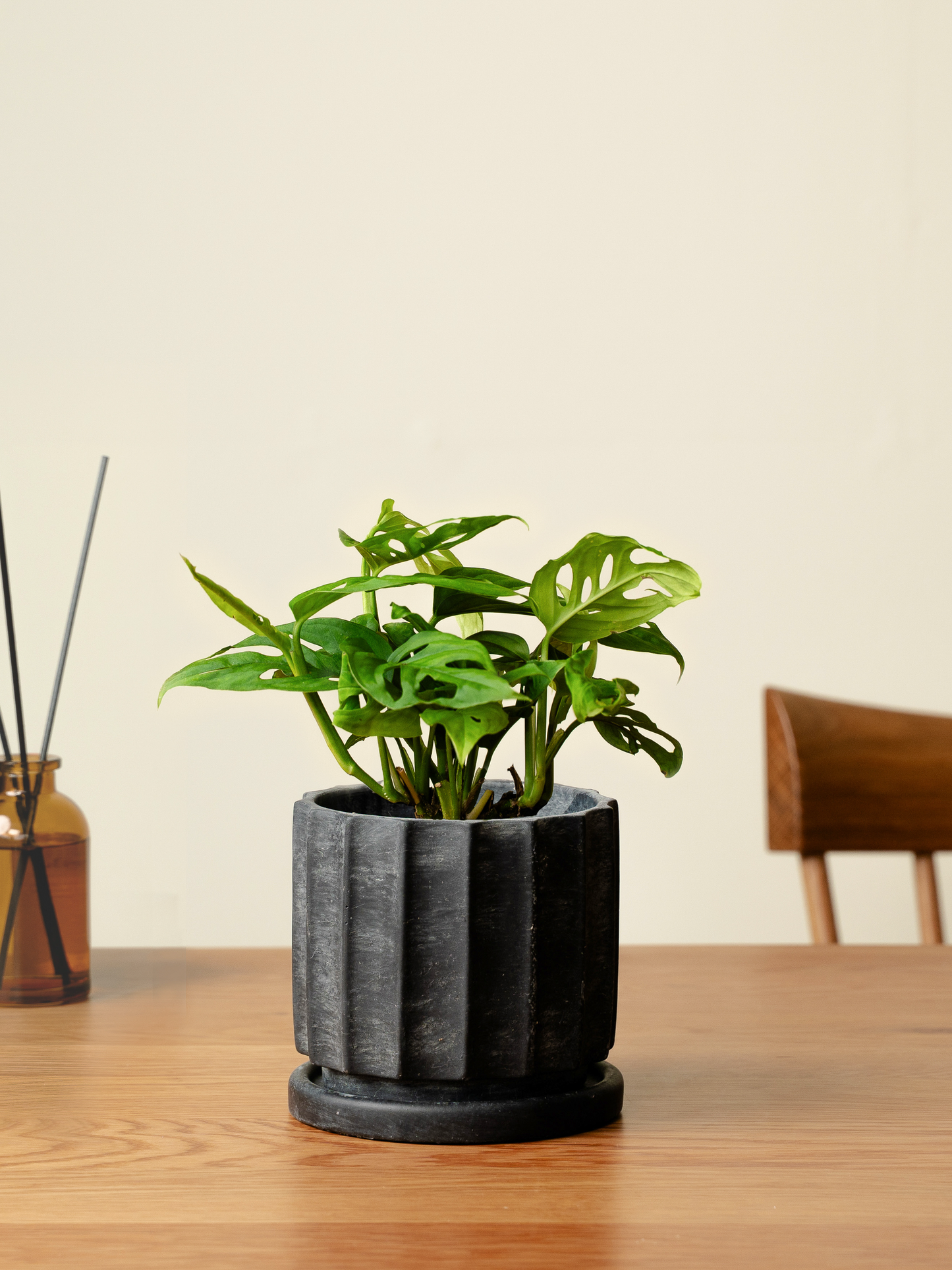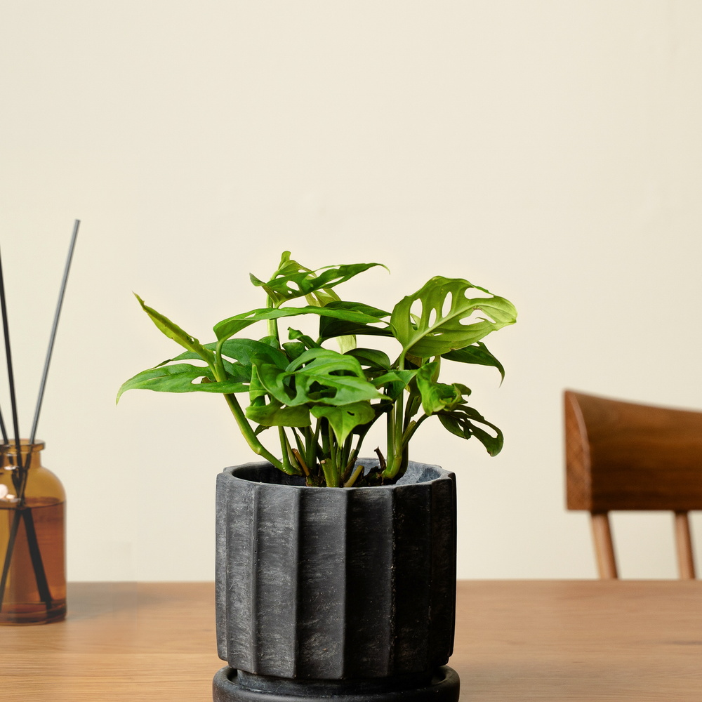 マドカズラは、穴の空いた葉が特徴的な観葉植物です。茎が伸びて垂れ下がる特性があるため、シェルフなど高さのある場所に置くことをおすすめします。