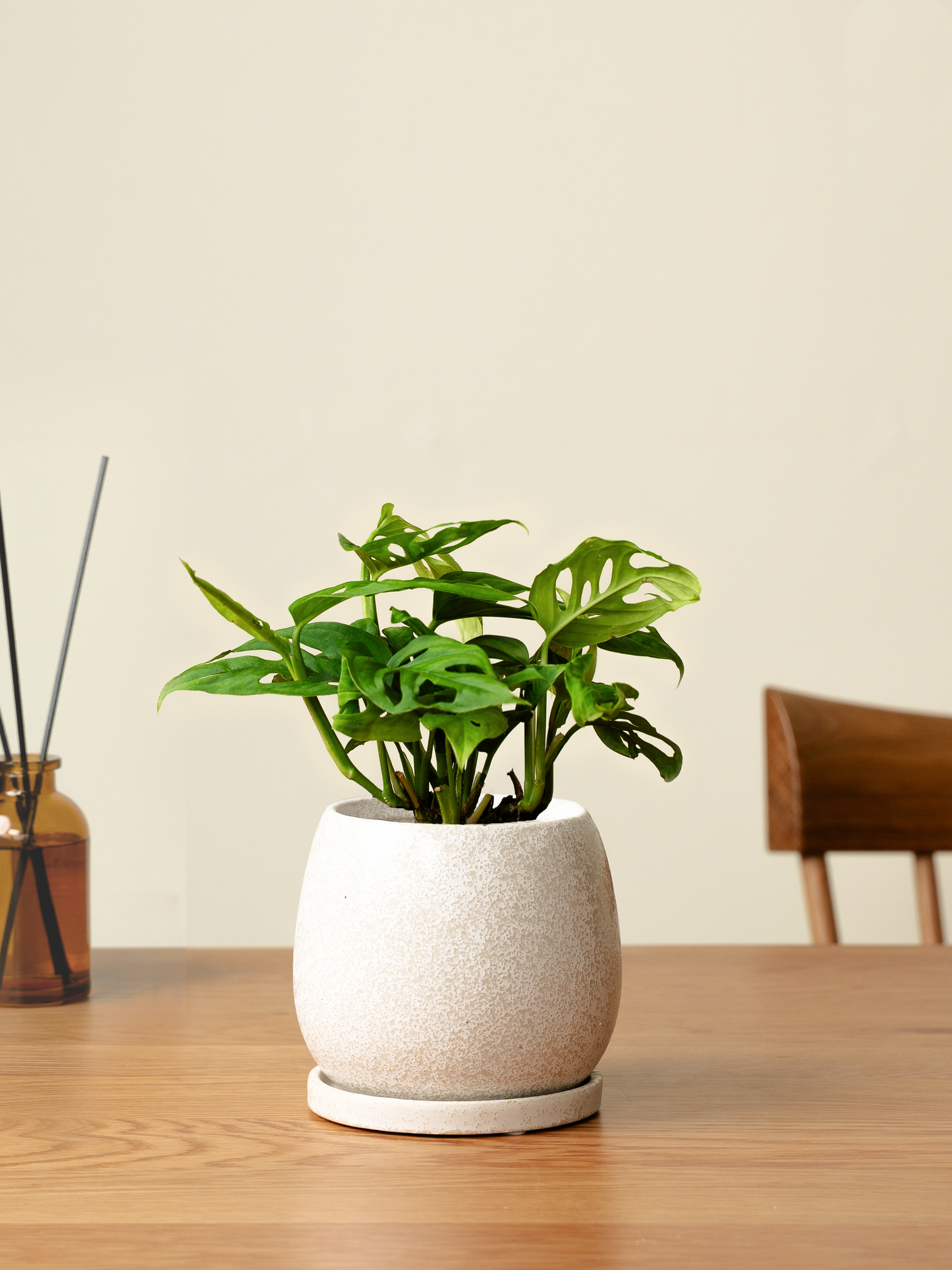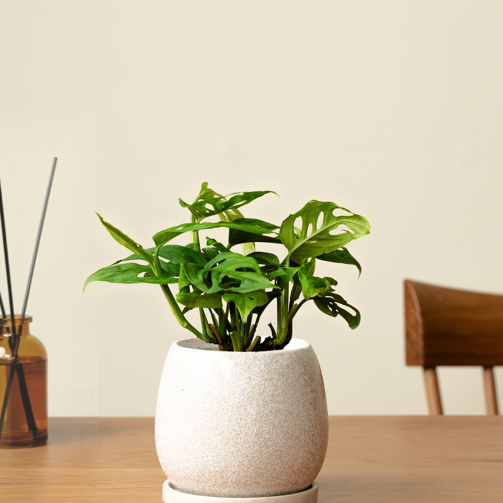 マドカズラは、穴の空いた葉が特徴的な観葉植物です。茎が伸びて垂れ下がる特性があるため、シェルフなど高さのある場所に置くことをおすすめします。