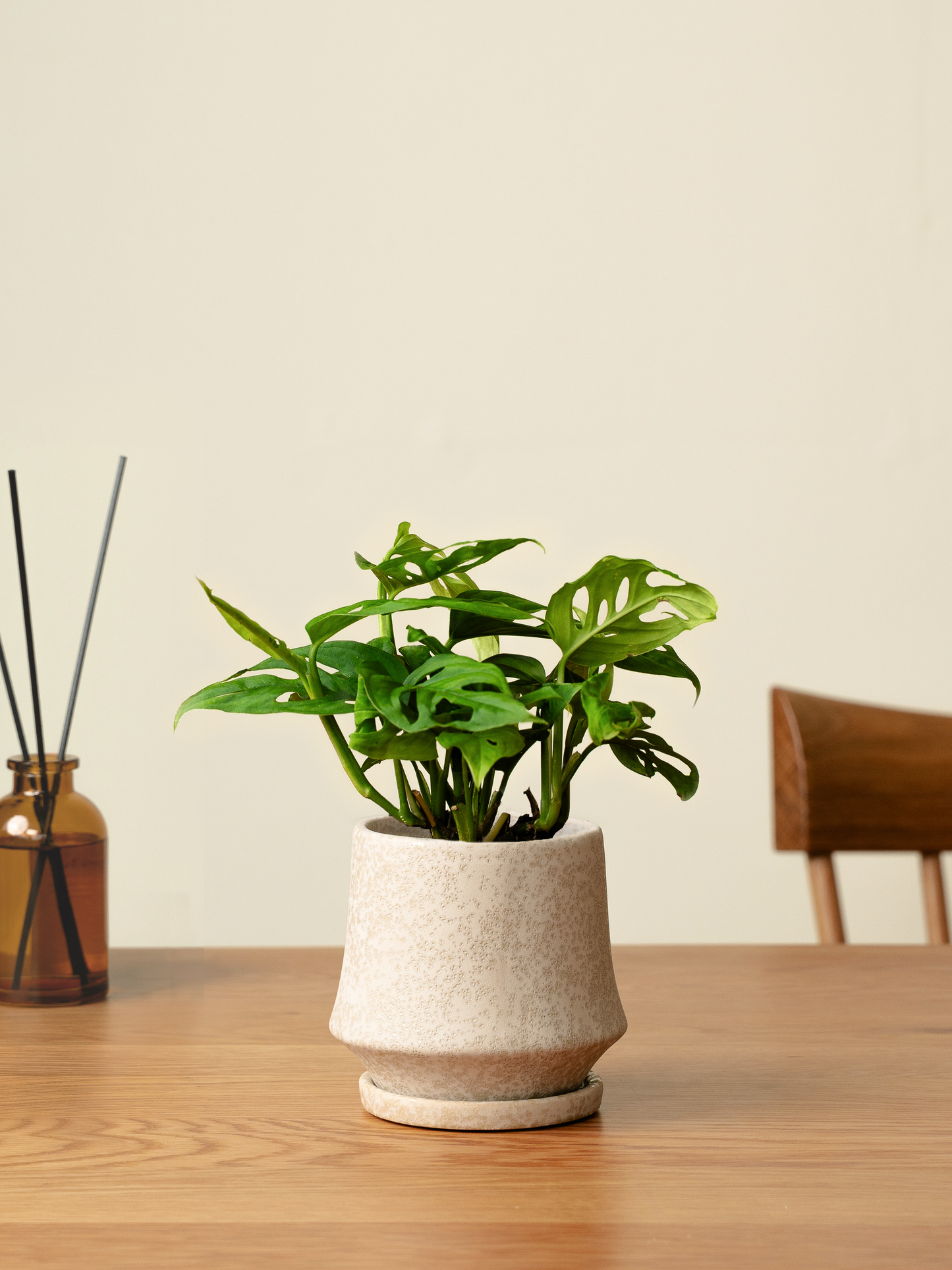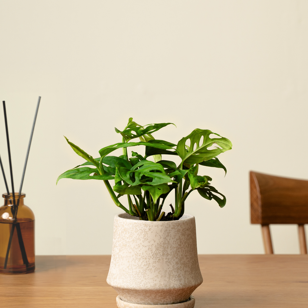 マドカズラは、穴の空いた葉が特徴的な観葉植物です。茎が伸びて垂れ下がる特性があるため、シェルフなど高さのある場所に置くことをおすすめします。