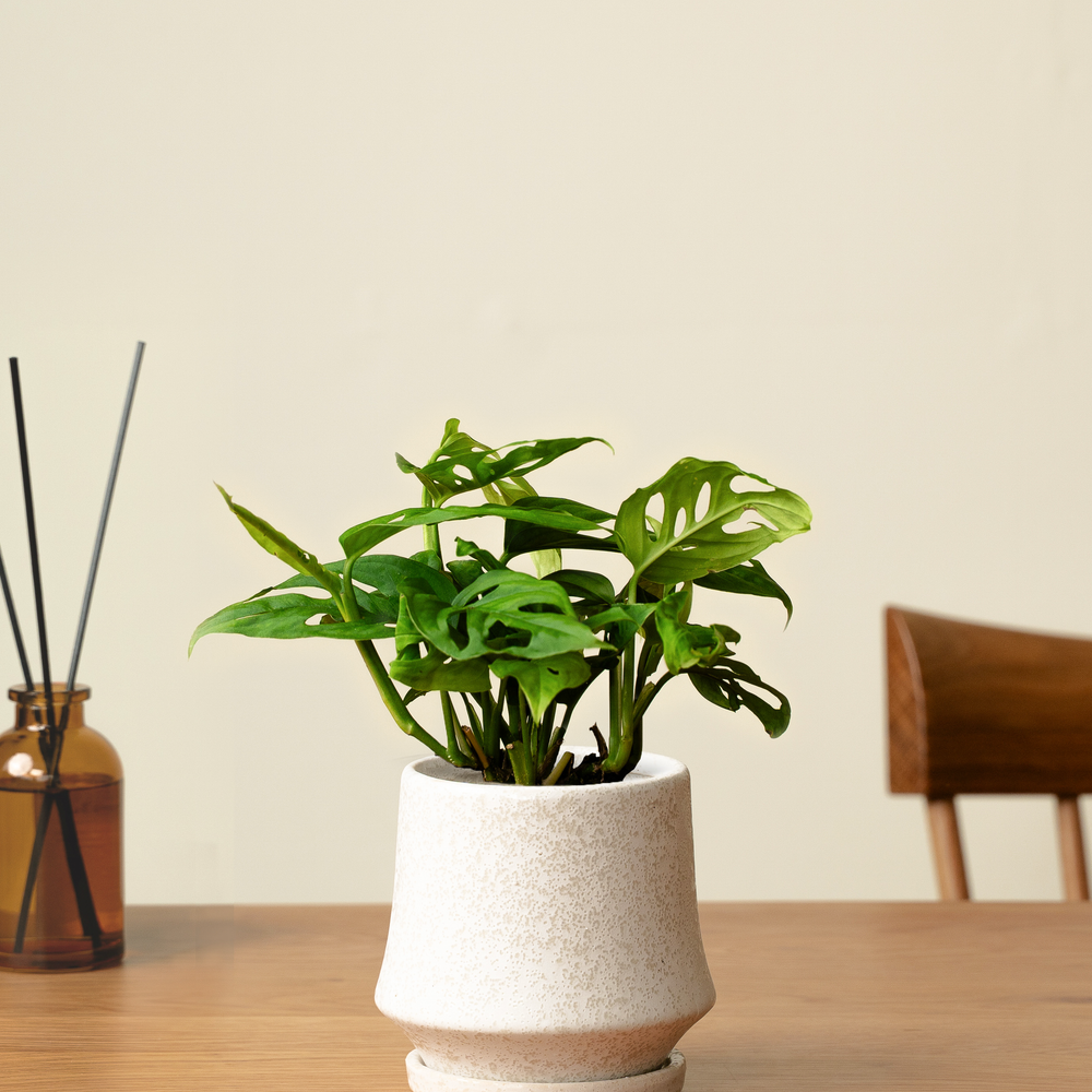 マドカズラは、穴の空いた葉が特徴的な観葉植物です。茎が伸びて垂れ下がる特性があるため、シェルフなど高さのある場所に置くことをおすすめします。