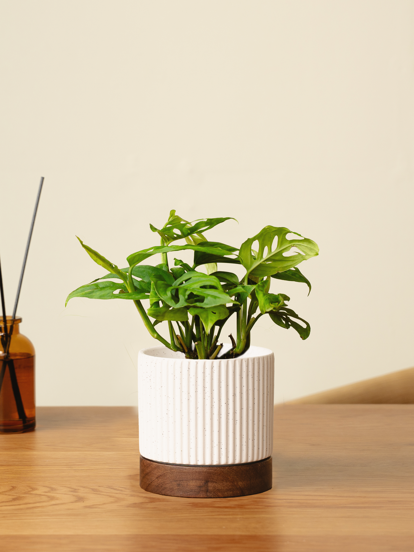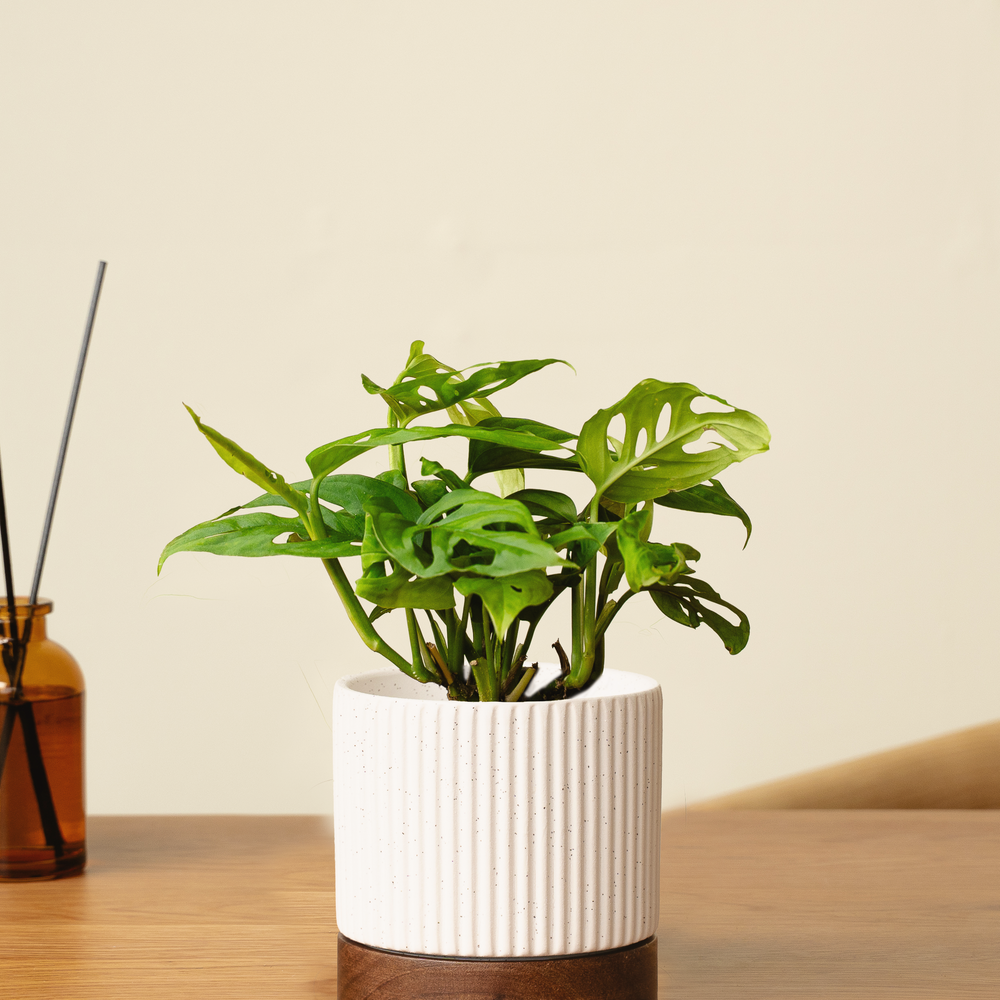 マドカズラは、穴の空いた葉が特徴的な観葉植物です。茎が伸びて垂れ下がる特性があるため、シェルフなど高さのある場所に置くことをおすすめします。