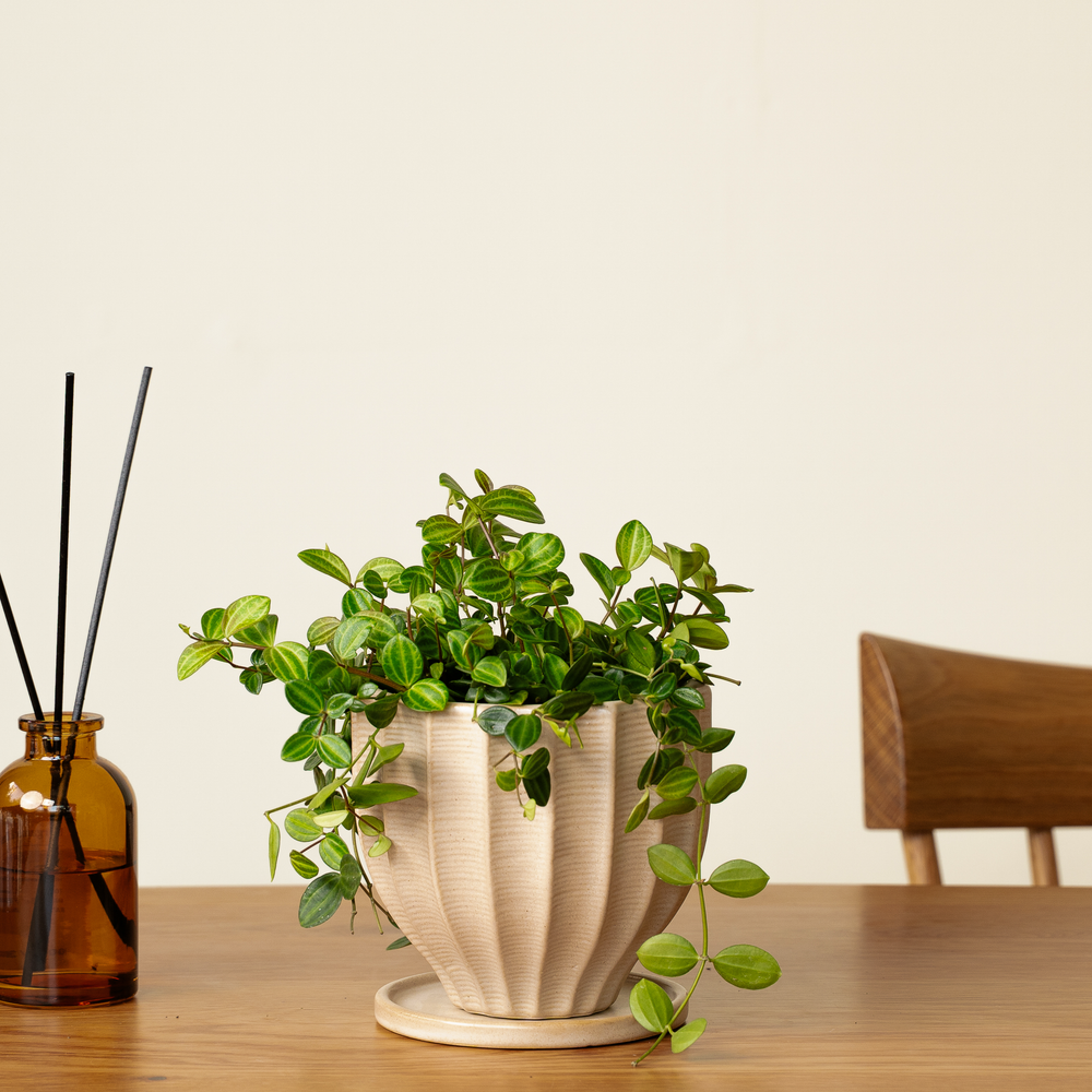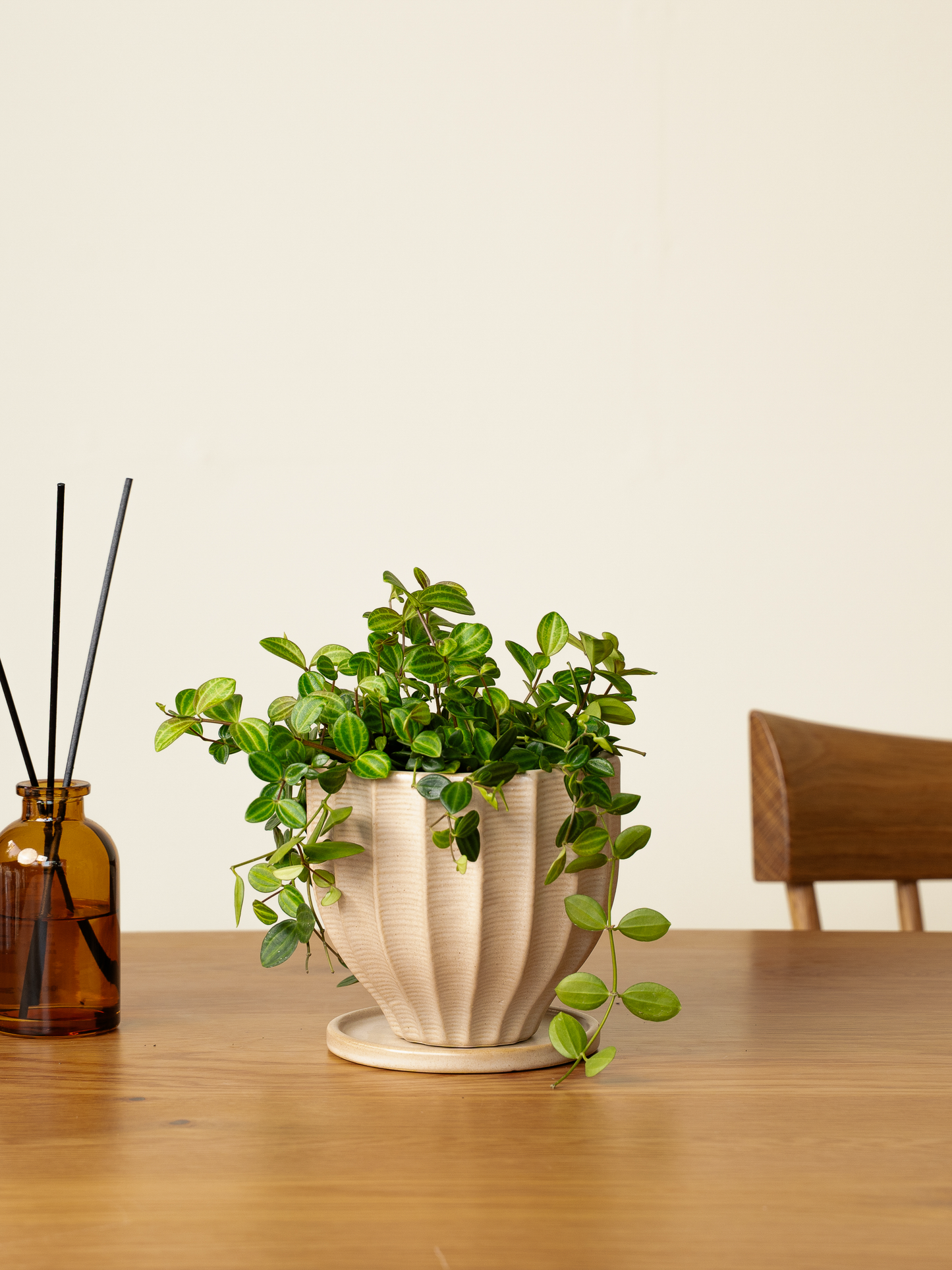 ペペロミアングラータは小さな葉に縞模様が入る可愛らしい小ぶりな観葉植物です。コンパクトなサイズで収まるため、卓上のインテリアとして最適です。