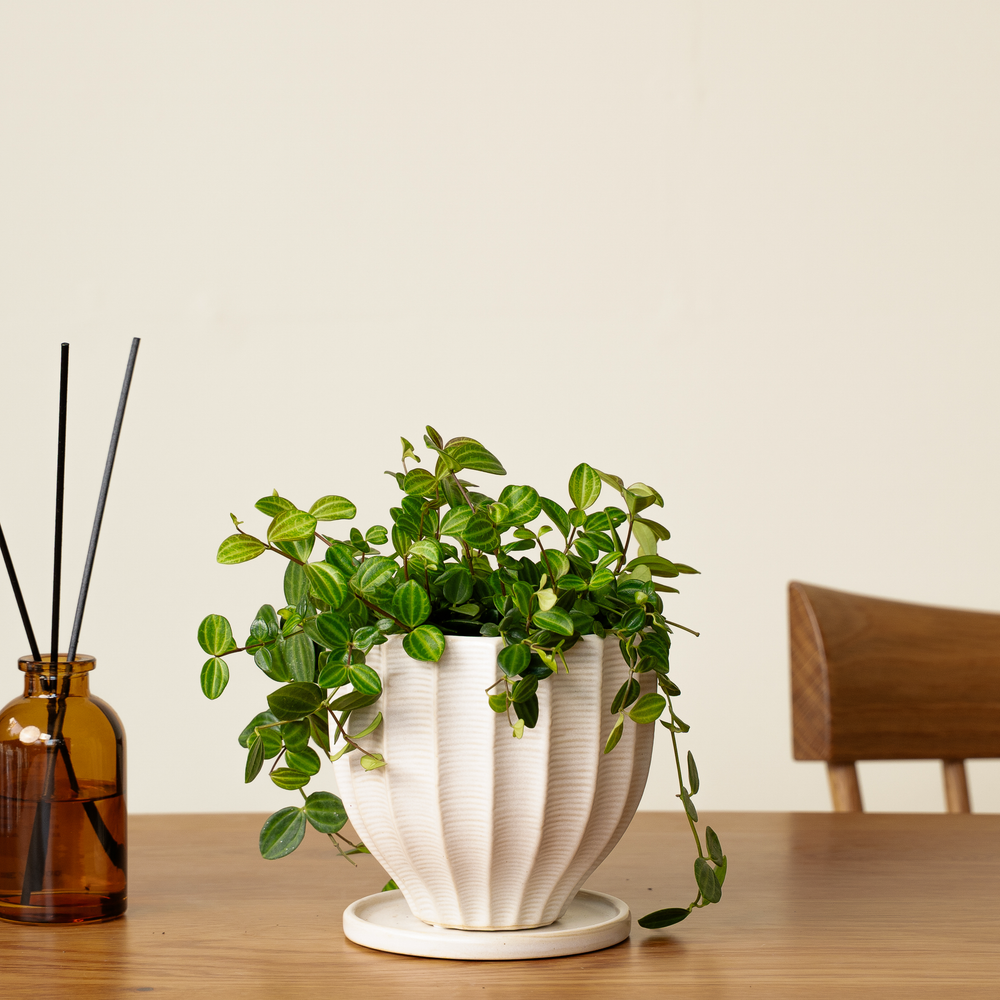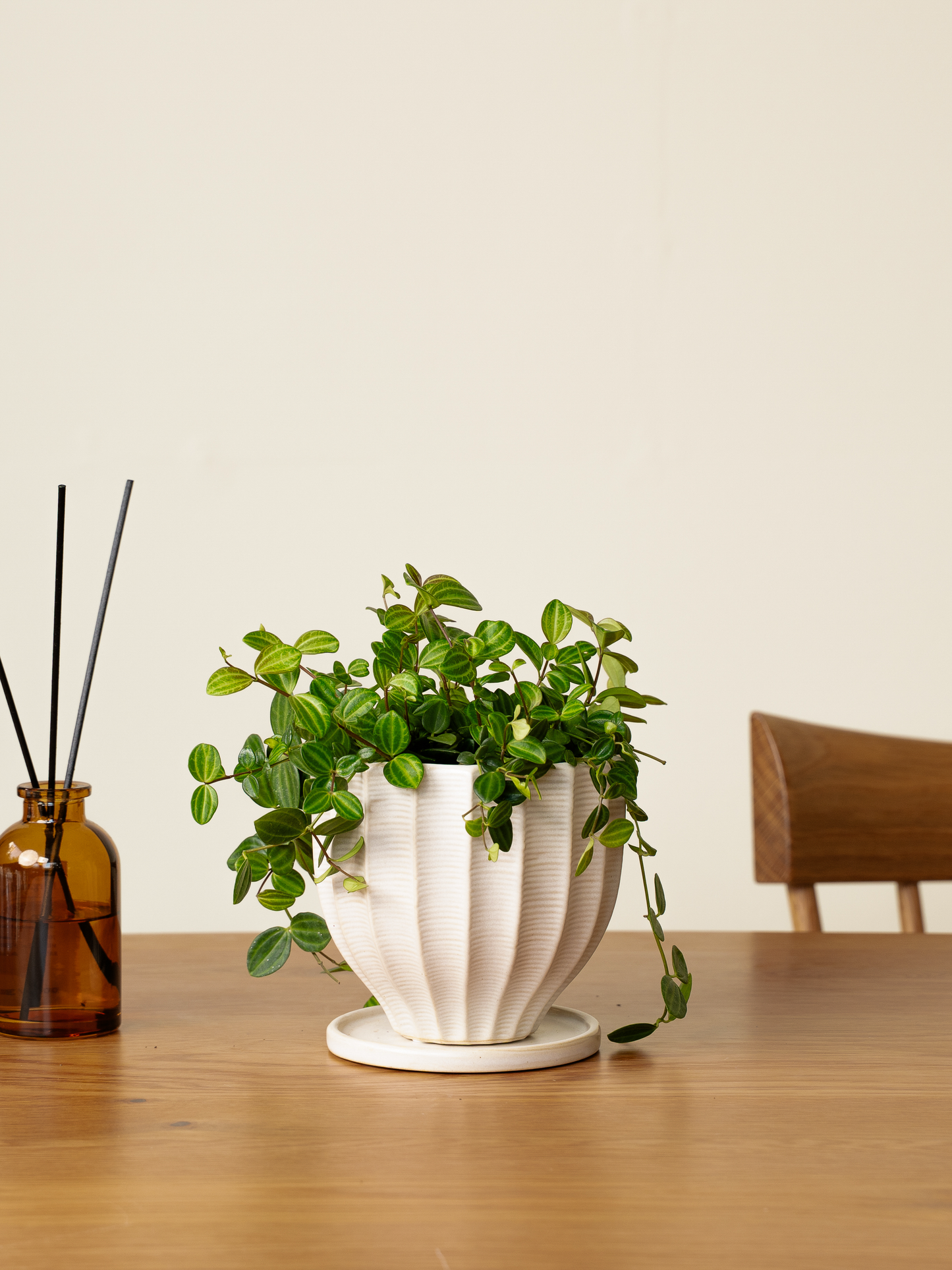 ペペロミアングラータは小さな葉に縞模様が入る可愛らしい小ぶりな観葉植物です。コンパクトなサイズで収まるため、卓上のインテリアとして最適です。