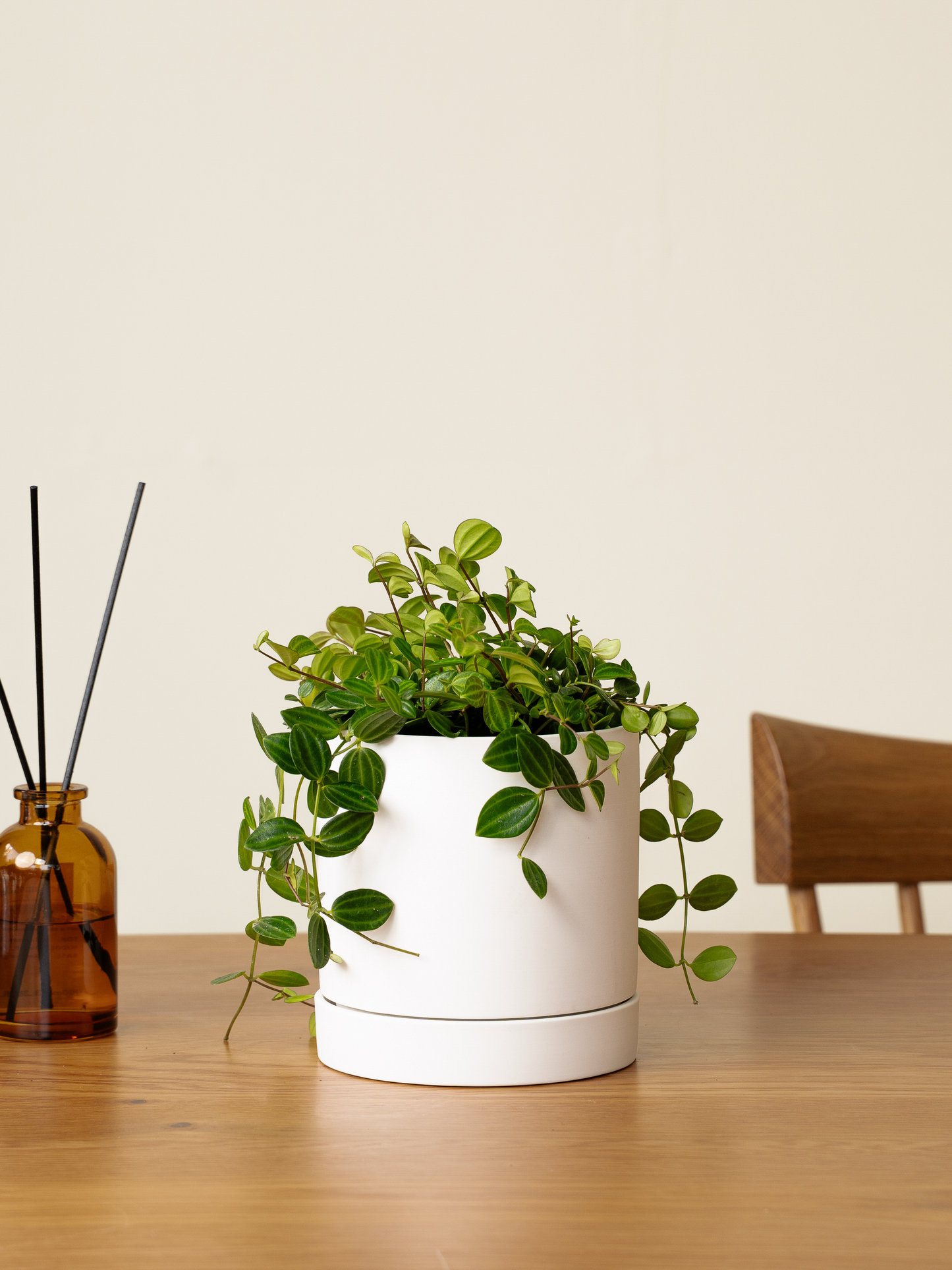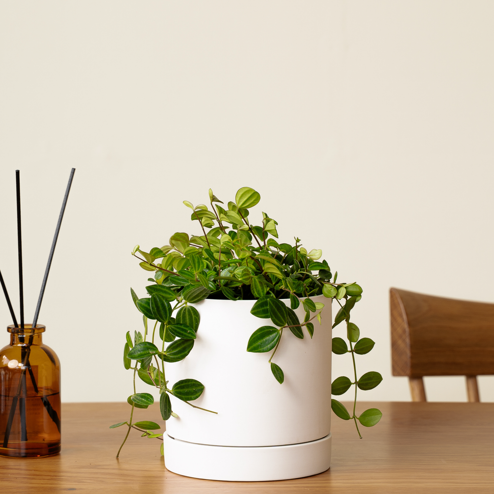 ペペロミアングラータは小さな葉に縞模様が入る可愛らしい小ぶりな観葉植物です。コンパクトなサイズで収まるため、卓上のインテリアとして最適です。
