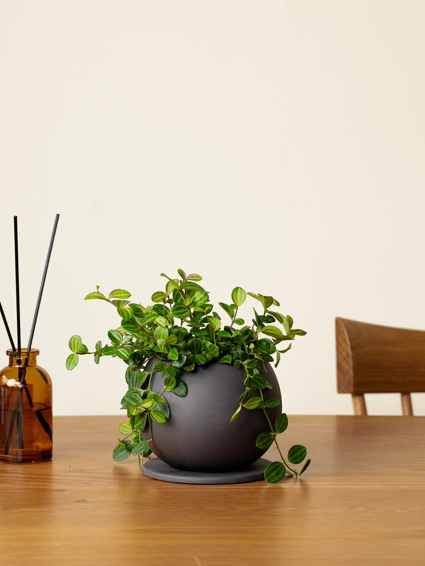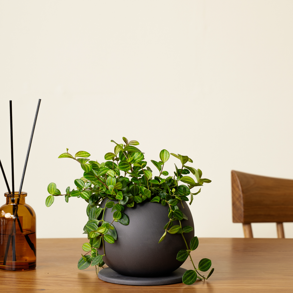 ペペロミアングラータは小さな葉に縞模様が入る可愛らしい小ぶりな観葉植物です。コンパクトなサイズで収まるため、卓上のインテリアとして最適です。