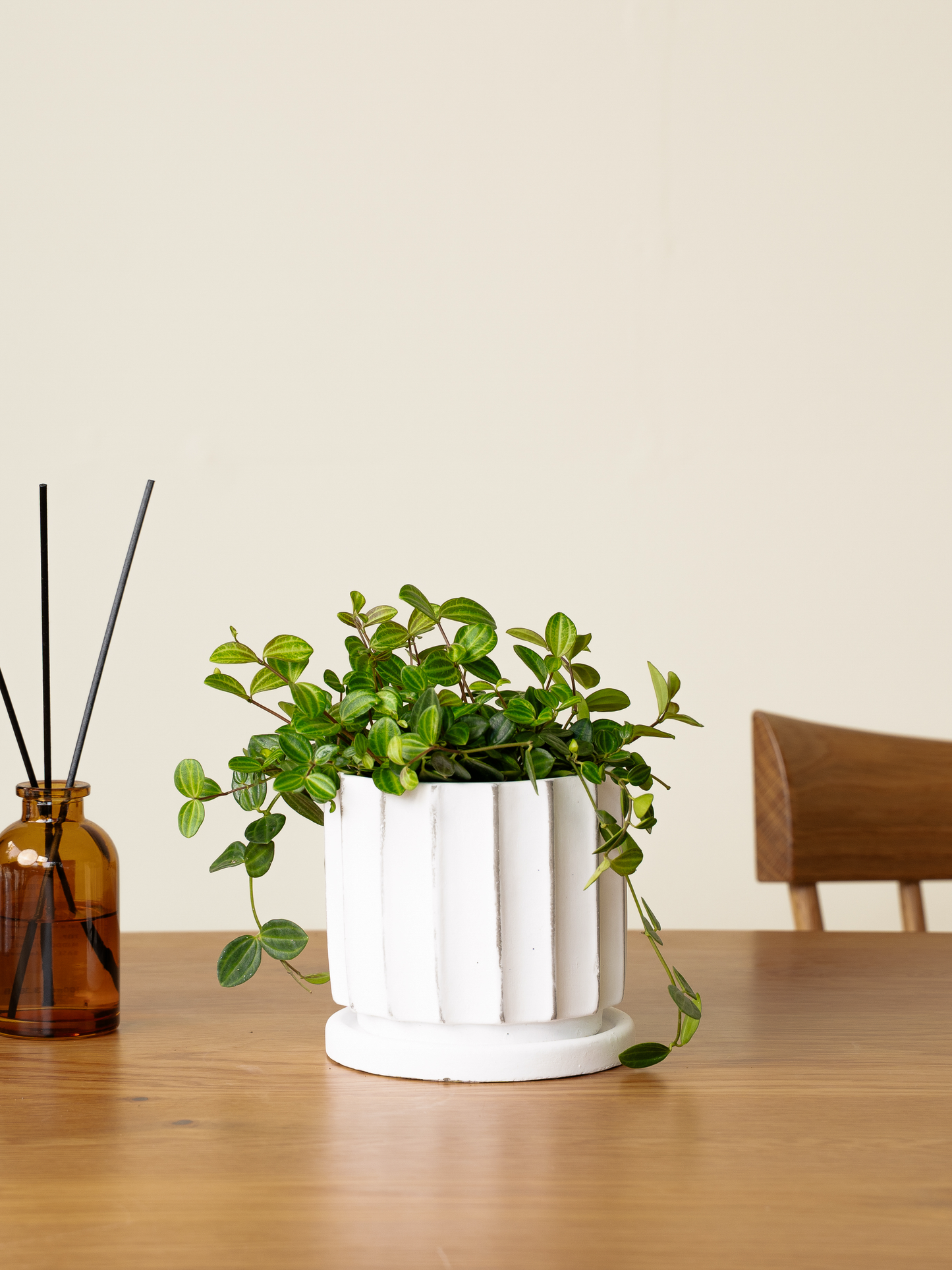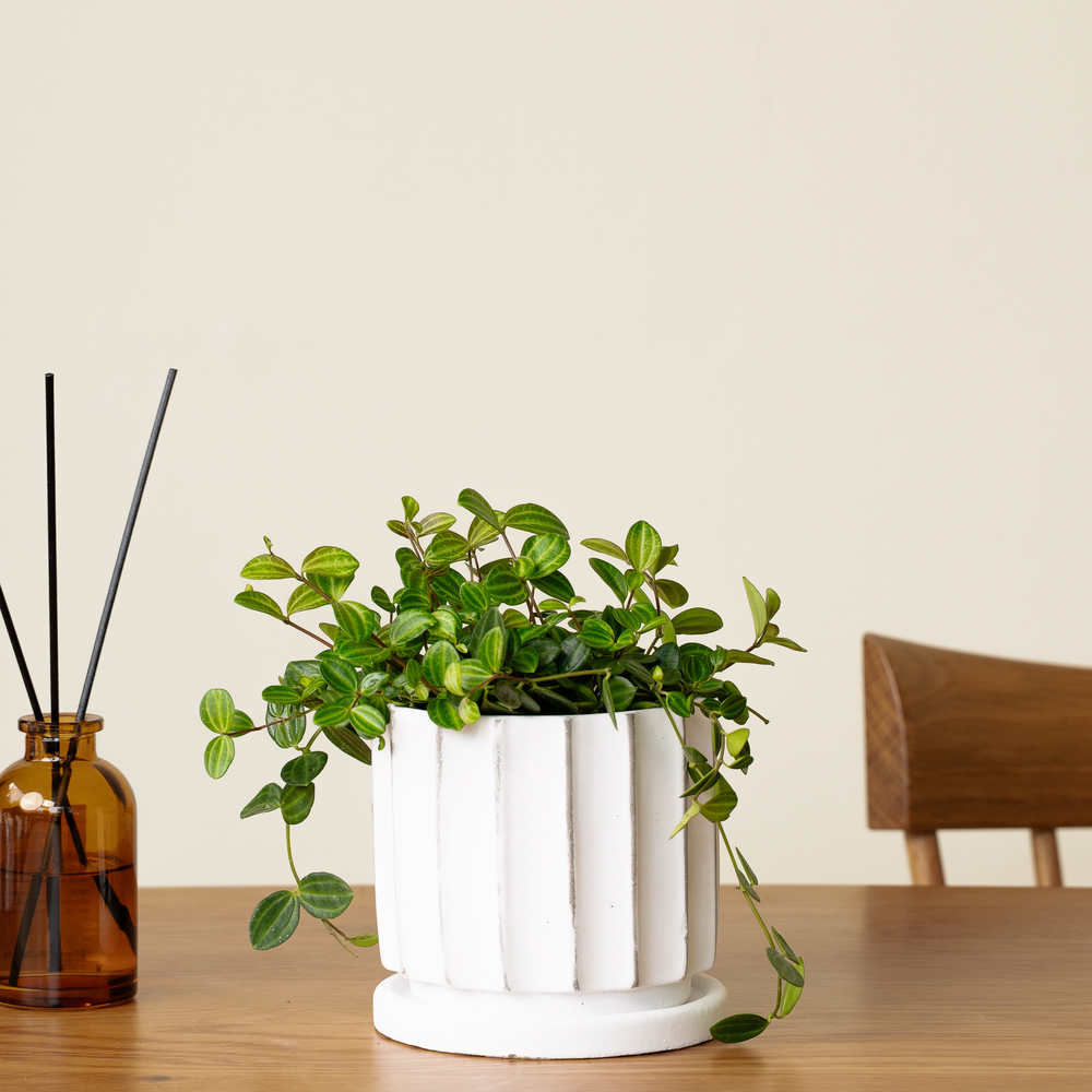ペペロミアングラータは小さな葉に縞模様が入る可愛らしい小ぶりな観葉植物です。コンパクトなサイズで収まるため、卓上のインテリアとして最適です。