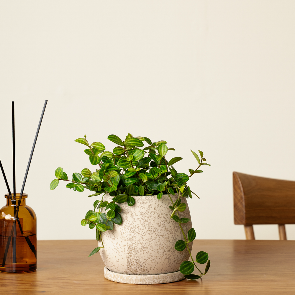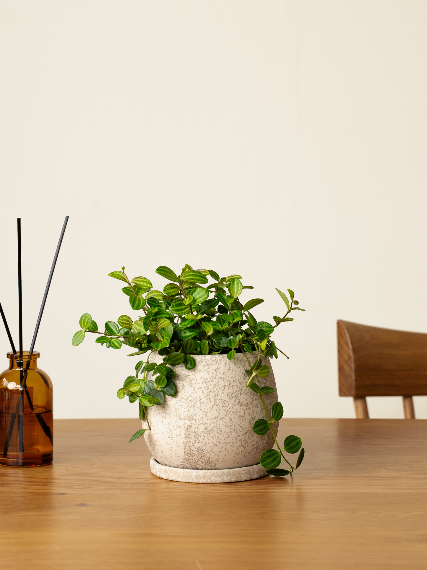 ペペロミアングラータは小さな葉に縞模様が入る可愛らしい小ぶりな観葉植物です。コンパクトなサイズで収まるため、卓上のインテリアとして最適です。