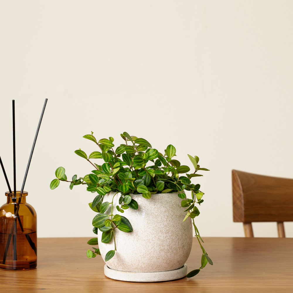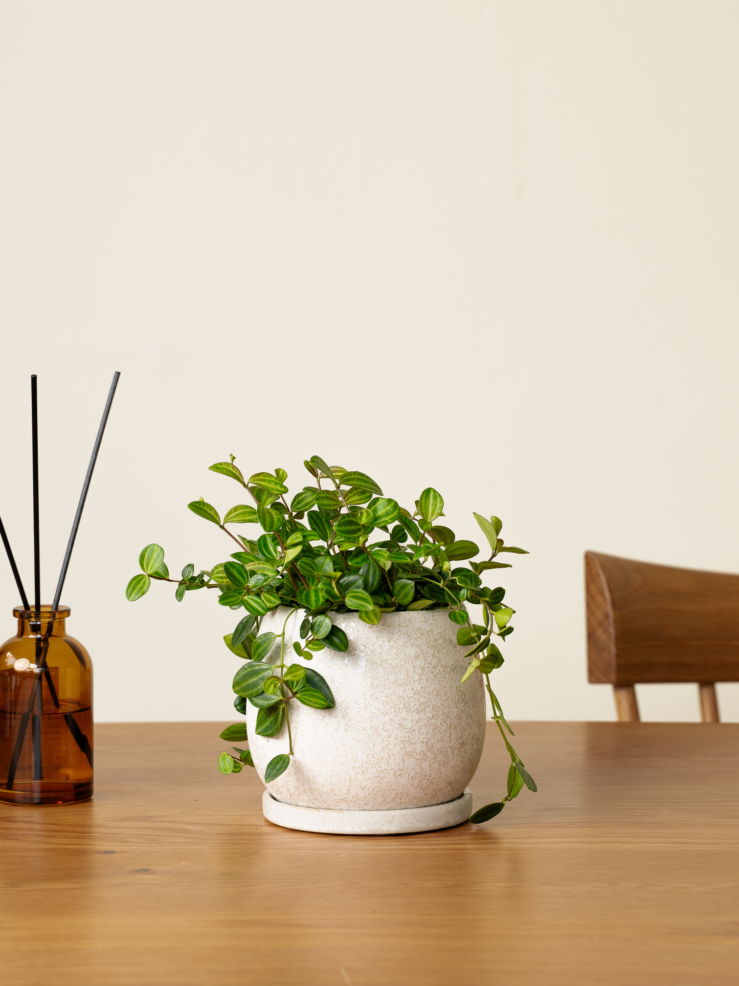 ペペロミアングラータは小さな葉に縞模様が入る可愛らしい小ぶりな観葉植物です。コンパクトなサイズで収まるため、卓上のインテリアとして最適です。