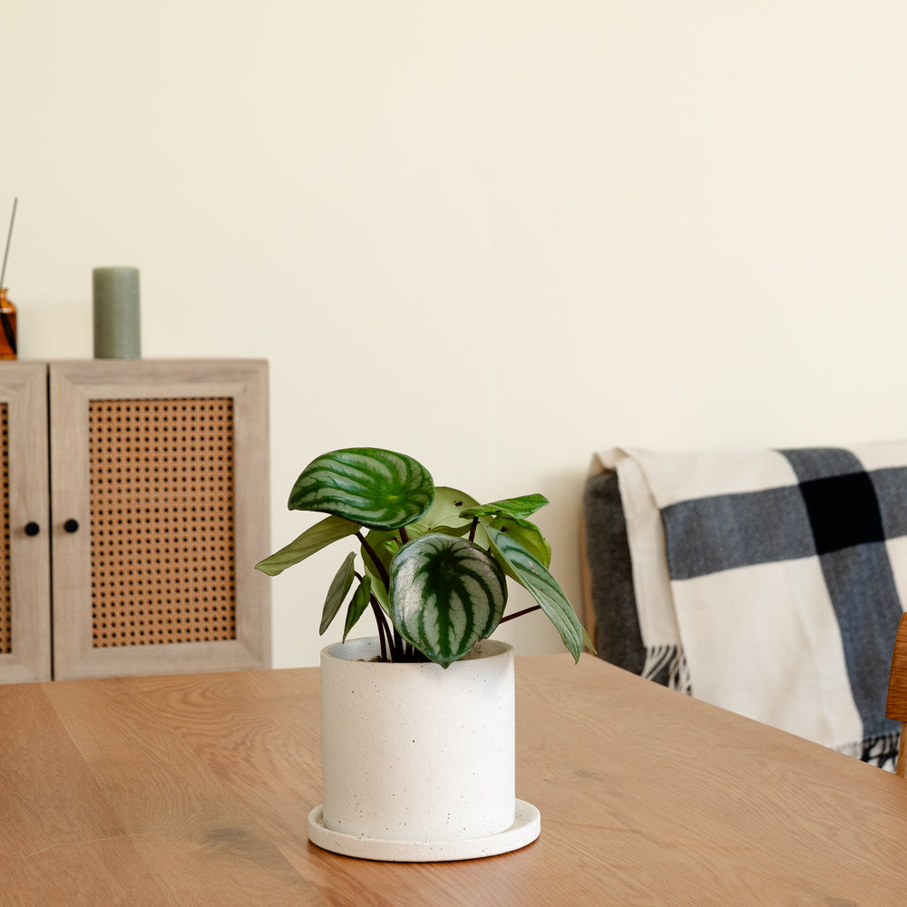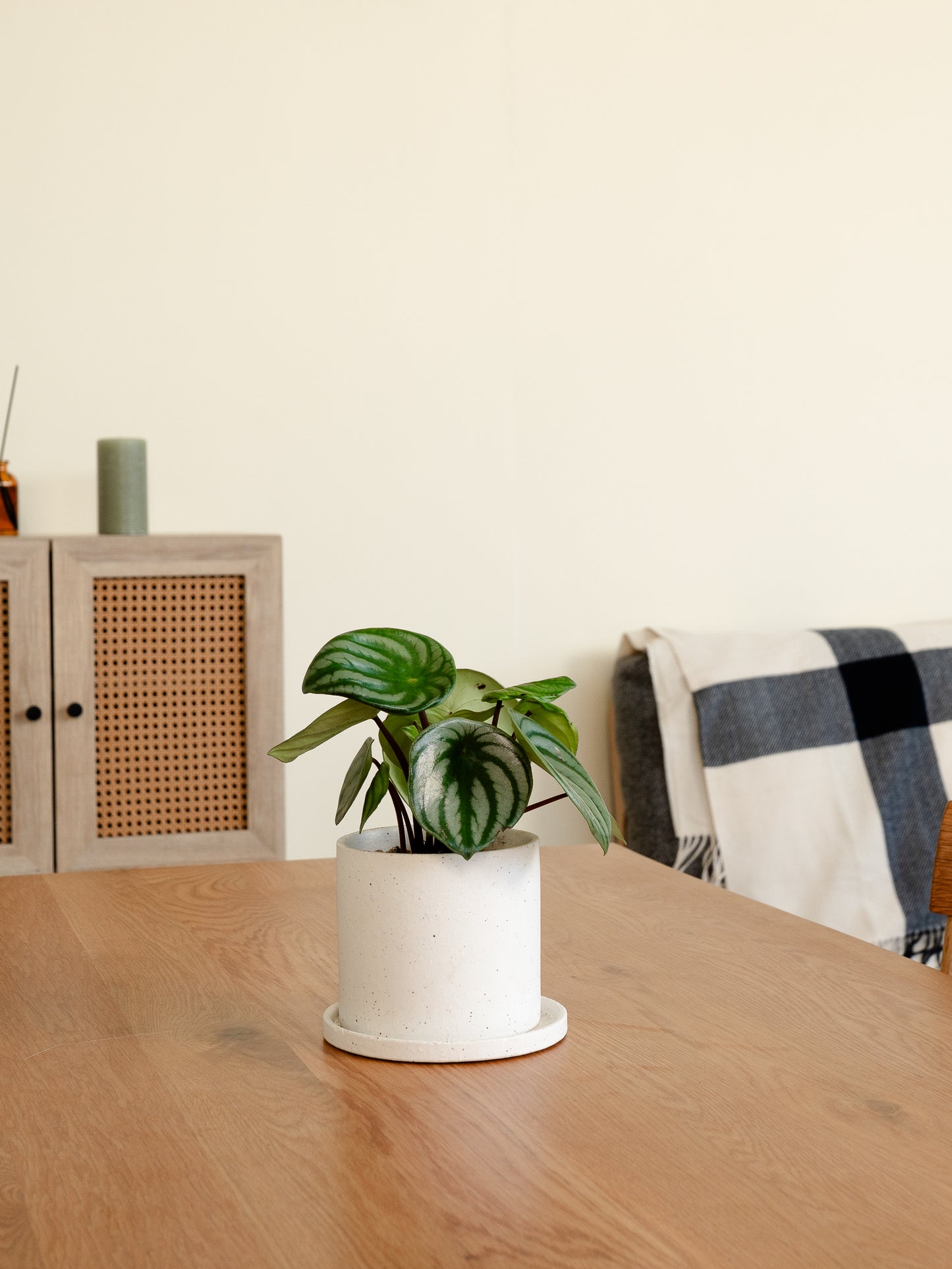 ペペロミアサンデルシーは、特徴的な模様からスイカペペロミアとも呼ばれる大きく丸い葉が印象的な観葉植物です。コンパクトなサイズで収まるため、テーブルの上などで長く楽しめます。