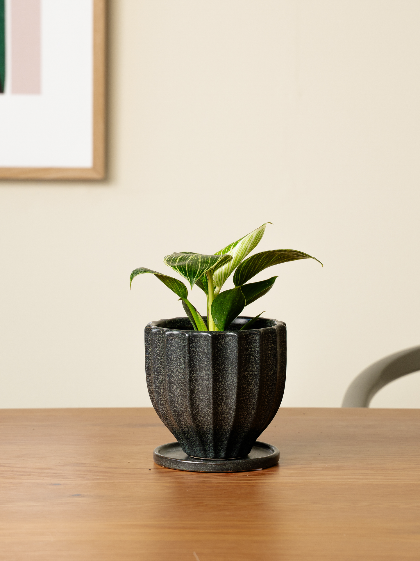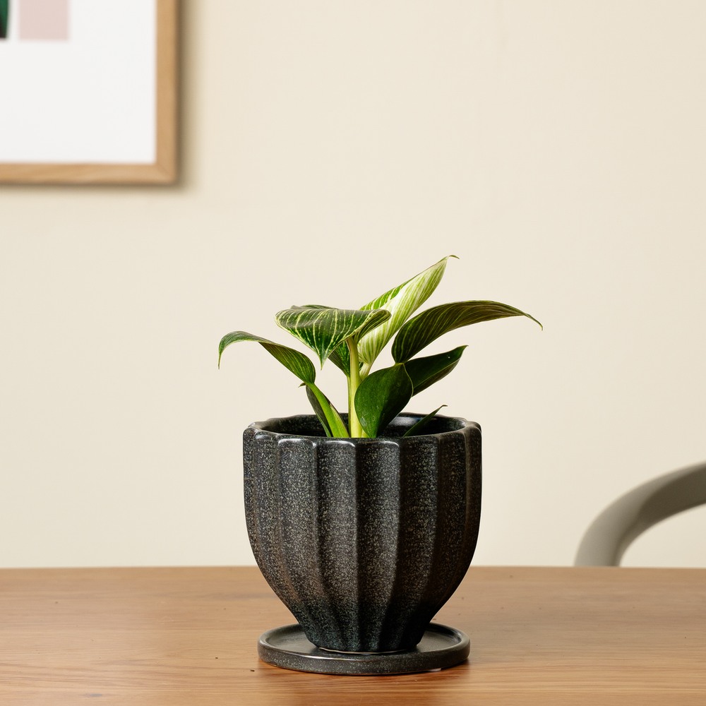 フィロデンドロン・バーキンは、深い緑に白いストライプ模様が入った葉が特徴の観葉植物です。成長は比較的ゆっくりで、コンパクトなサイズ感も相まって室内での管理がしやすく、初心者にも人気があります。