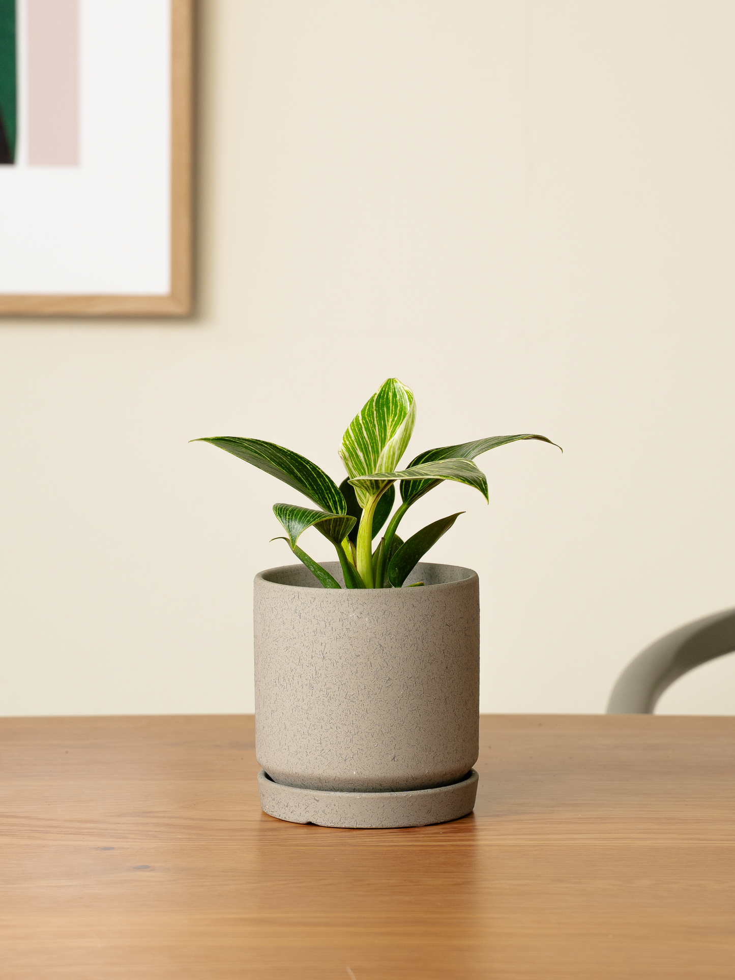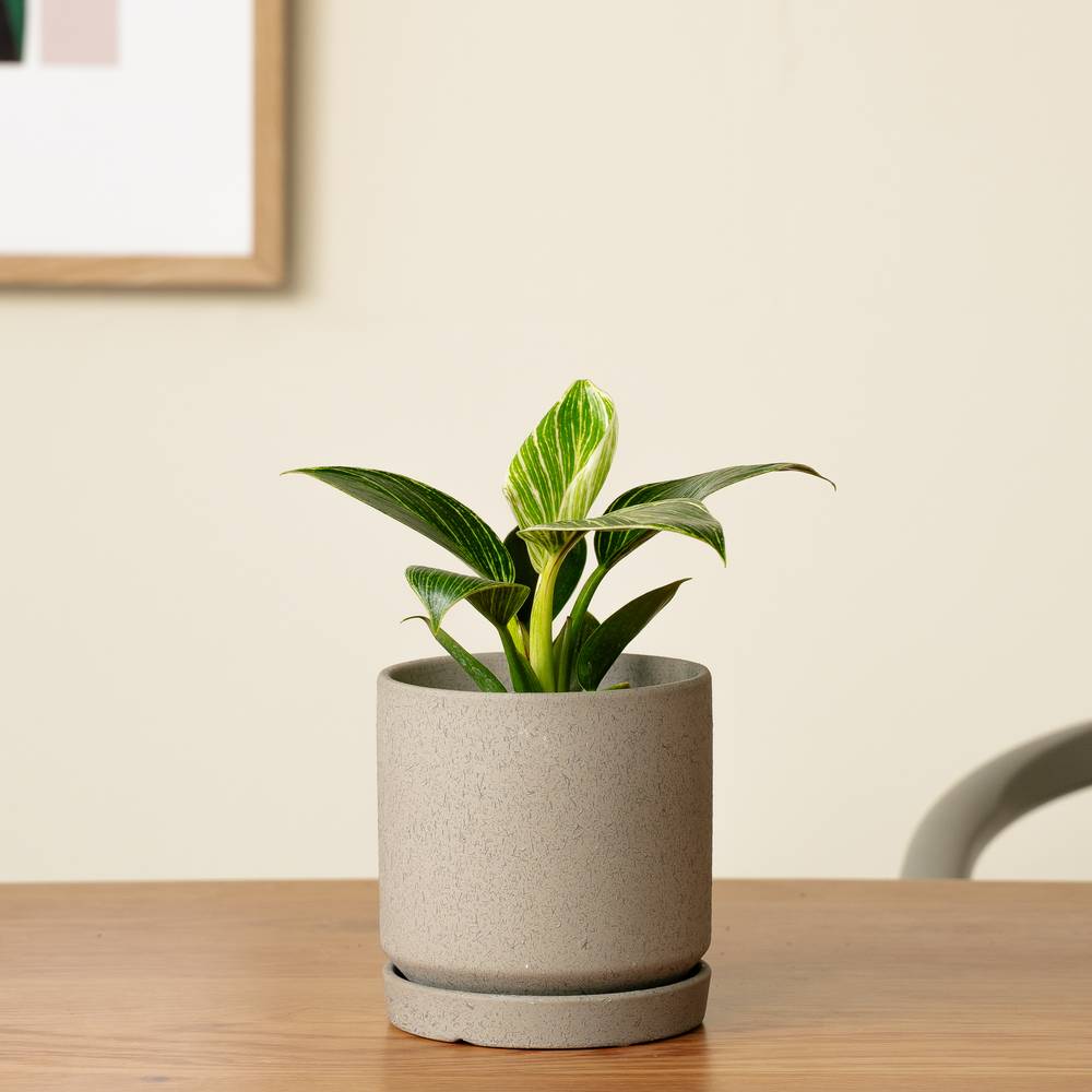 フィロデンドロン・バーキンは、深い緑に白いストライプ模様が入った葉が特徴の観葉植物です。成長は比較的ゆっくりで、コンパクトなサイズ感も相まって室内での管理がしやすく、初心者にも人気があります。
