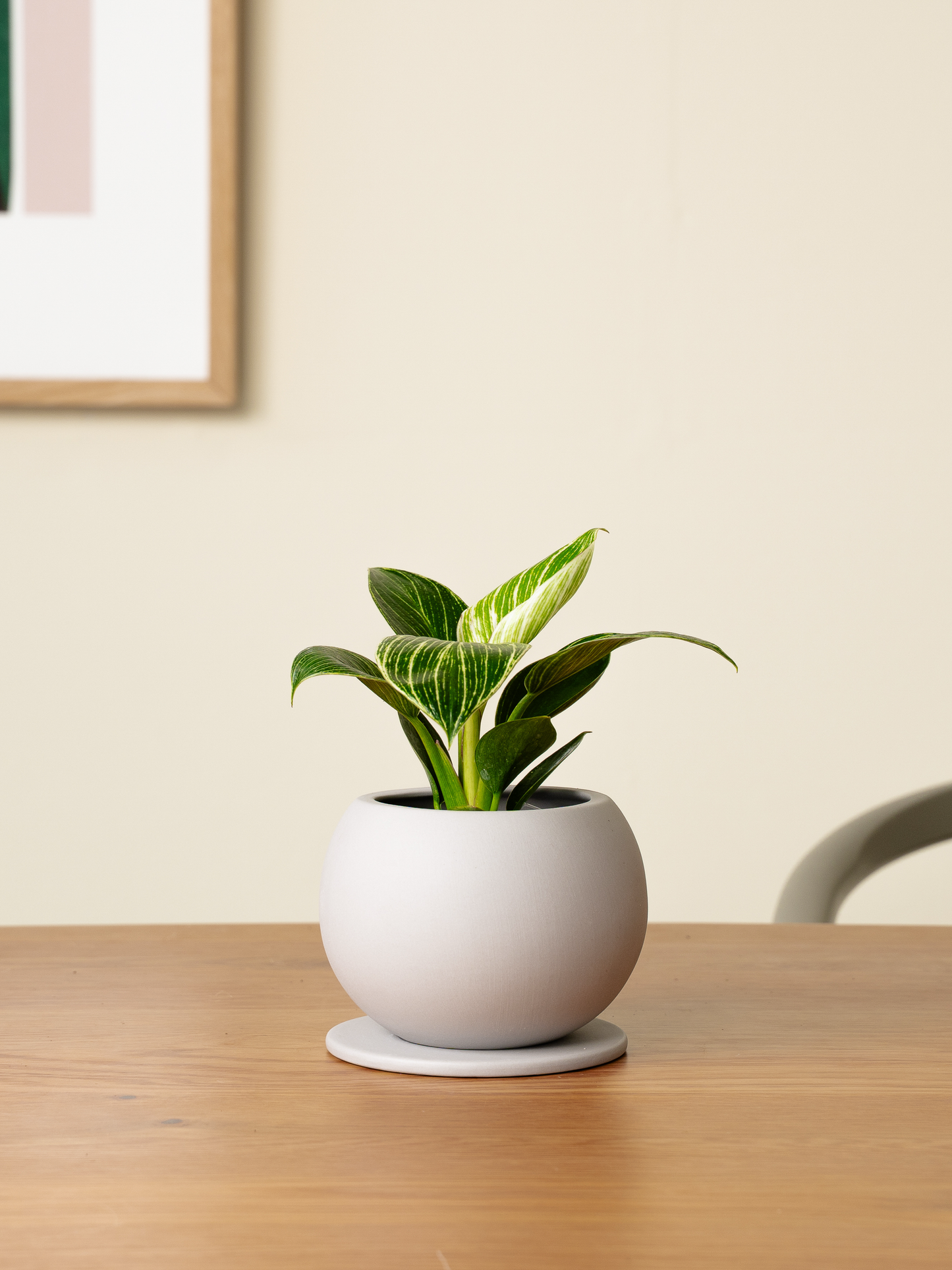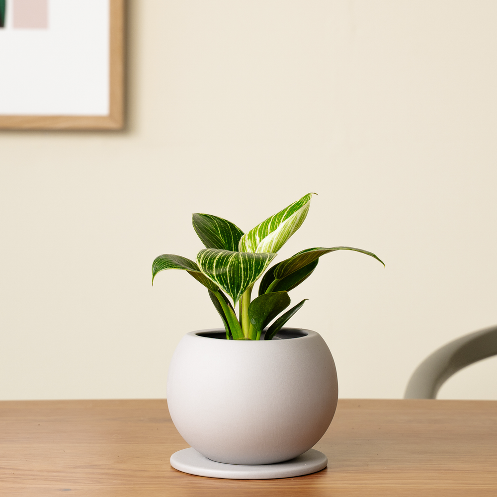 フィロデンドロン・バーキンは、深い緑に白いストライプ模様が入った葉が特徴の観葉植物です。成長は比較的ゆっくりで、コンパクトなサイズ感も相まって室内での管理がしやすく、初心者にも人気があります。