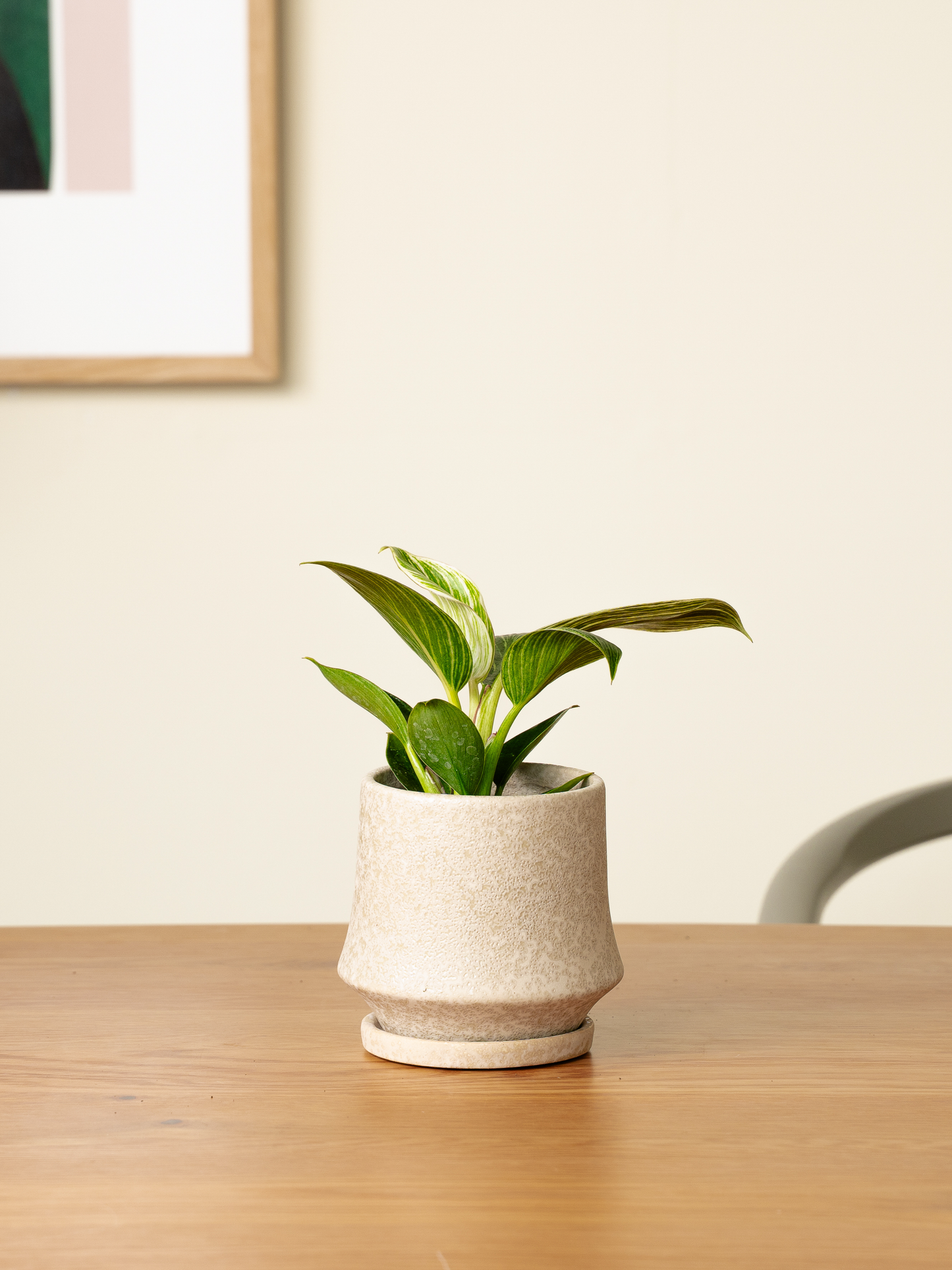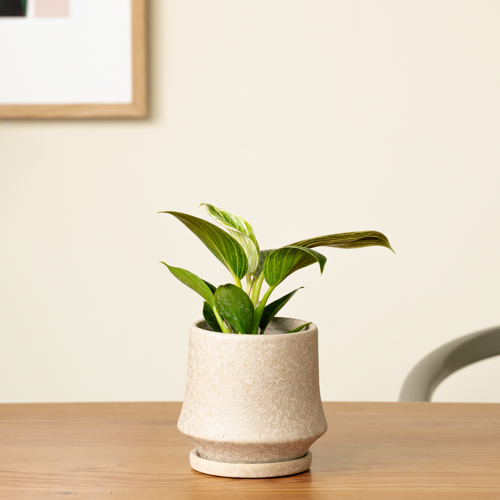 フィロデンドロン・バーキンは、深い緑に白いストライプ模様が入った葉が特徴の観葉植物です。成長は比較的ゆっくりで、コンパクトなサイズ感も相まって室内での管理がしやすく、初心者にも人気があります。