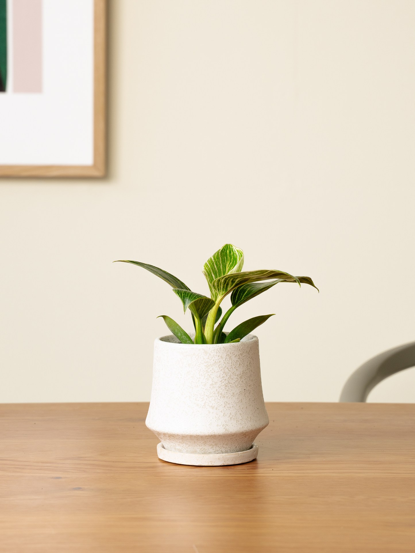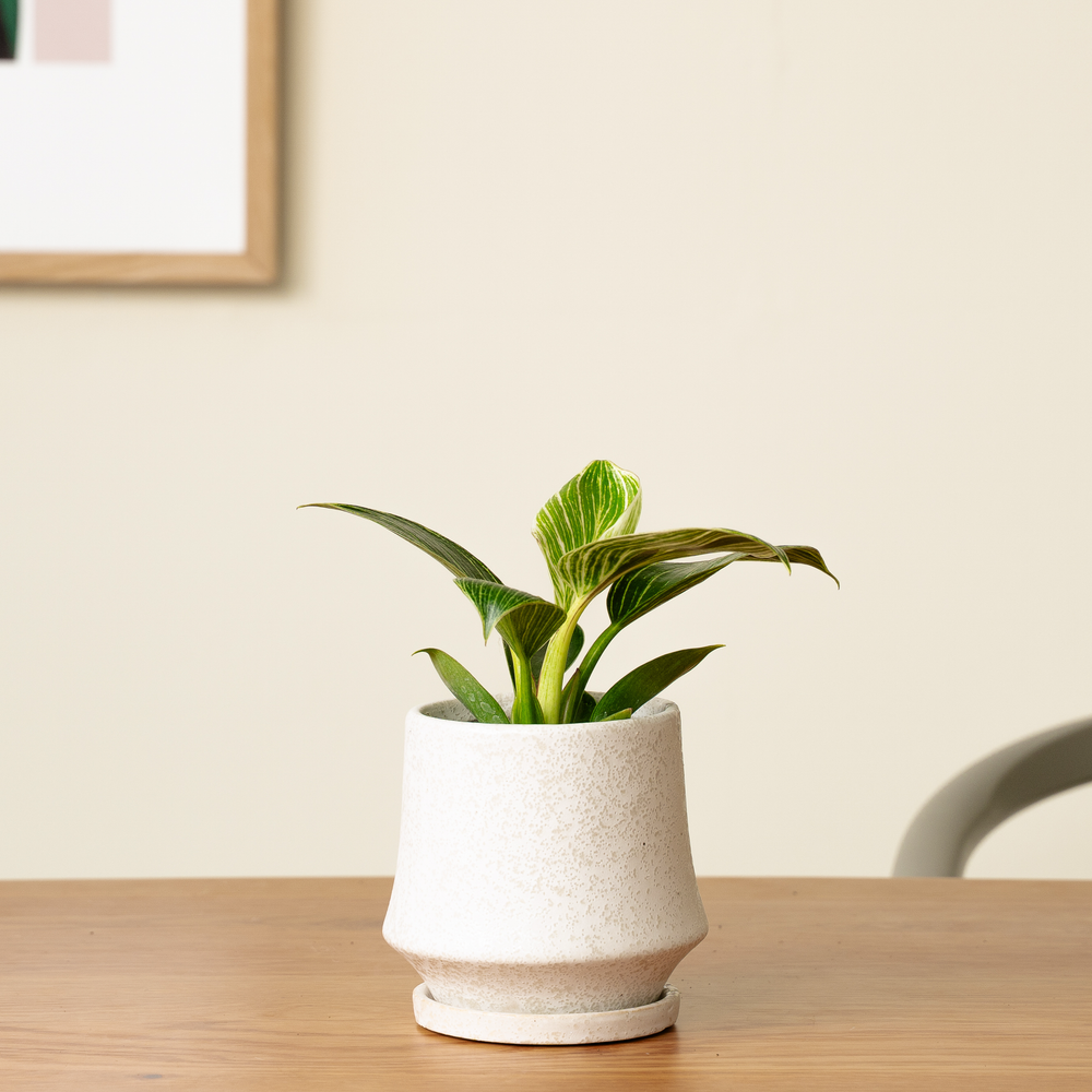 フィロデンドロン・バーキンは、深い緑に白いストライプ模様が入った葉が特徴の観葉植物です。成長は比較的ゆっくりで、コンパクトなサイズ感も相まって室内での管理がしやすく、初心者にも人気があります。