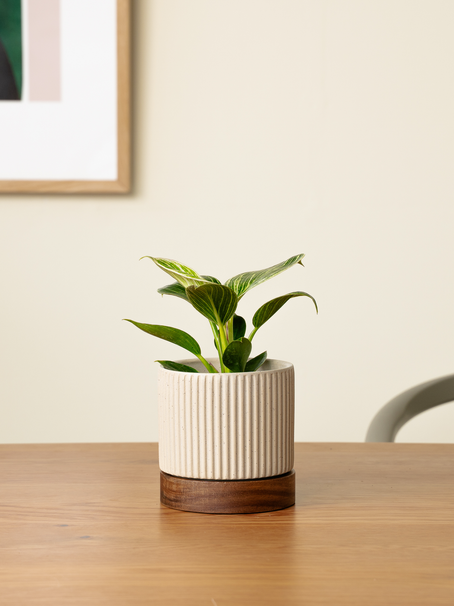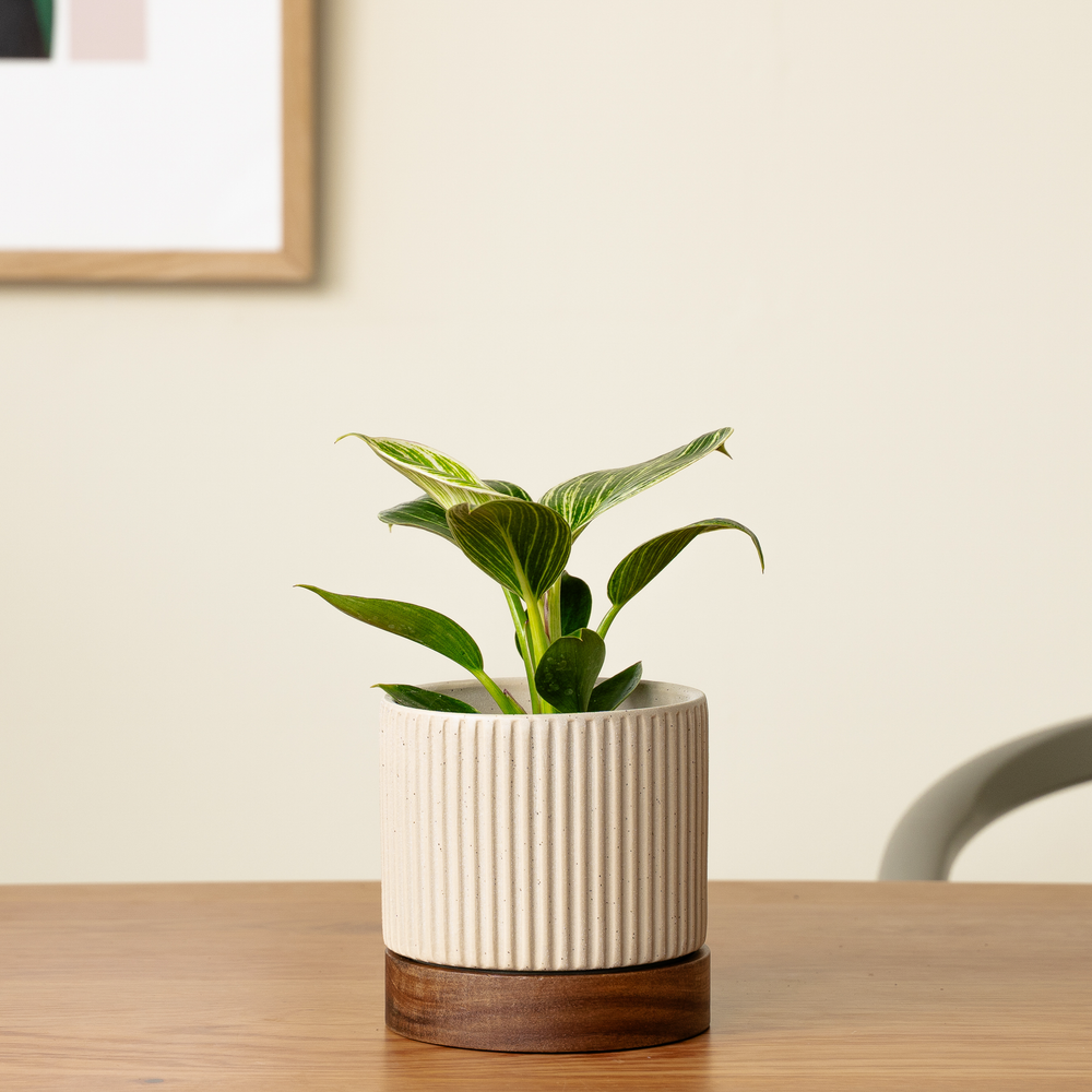 フィロデンドロン・バーキンは、深い緑に白いストライプ模様が入った葉が特徴の観葉植物です。成長は比較的ゆっくりで、コンパクトなサイズ感も相まって室内での管理がしやすく、初心者にも人気があります。