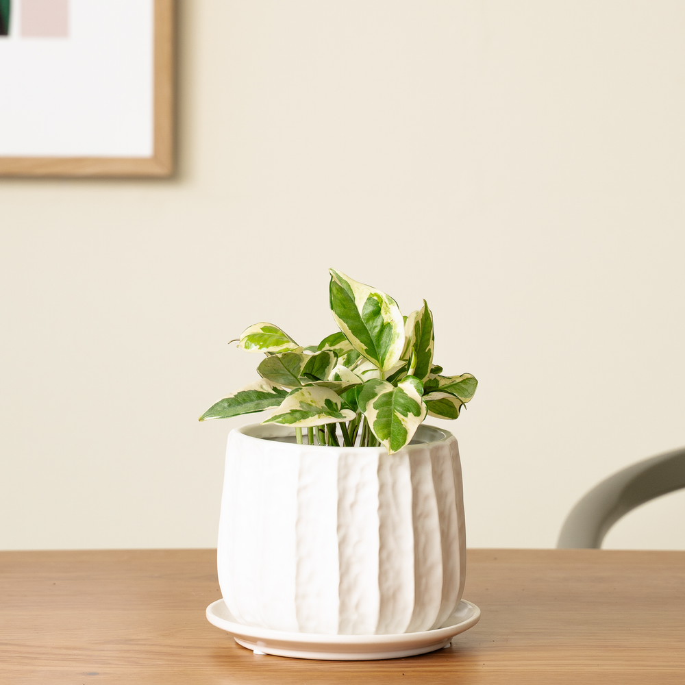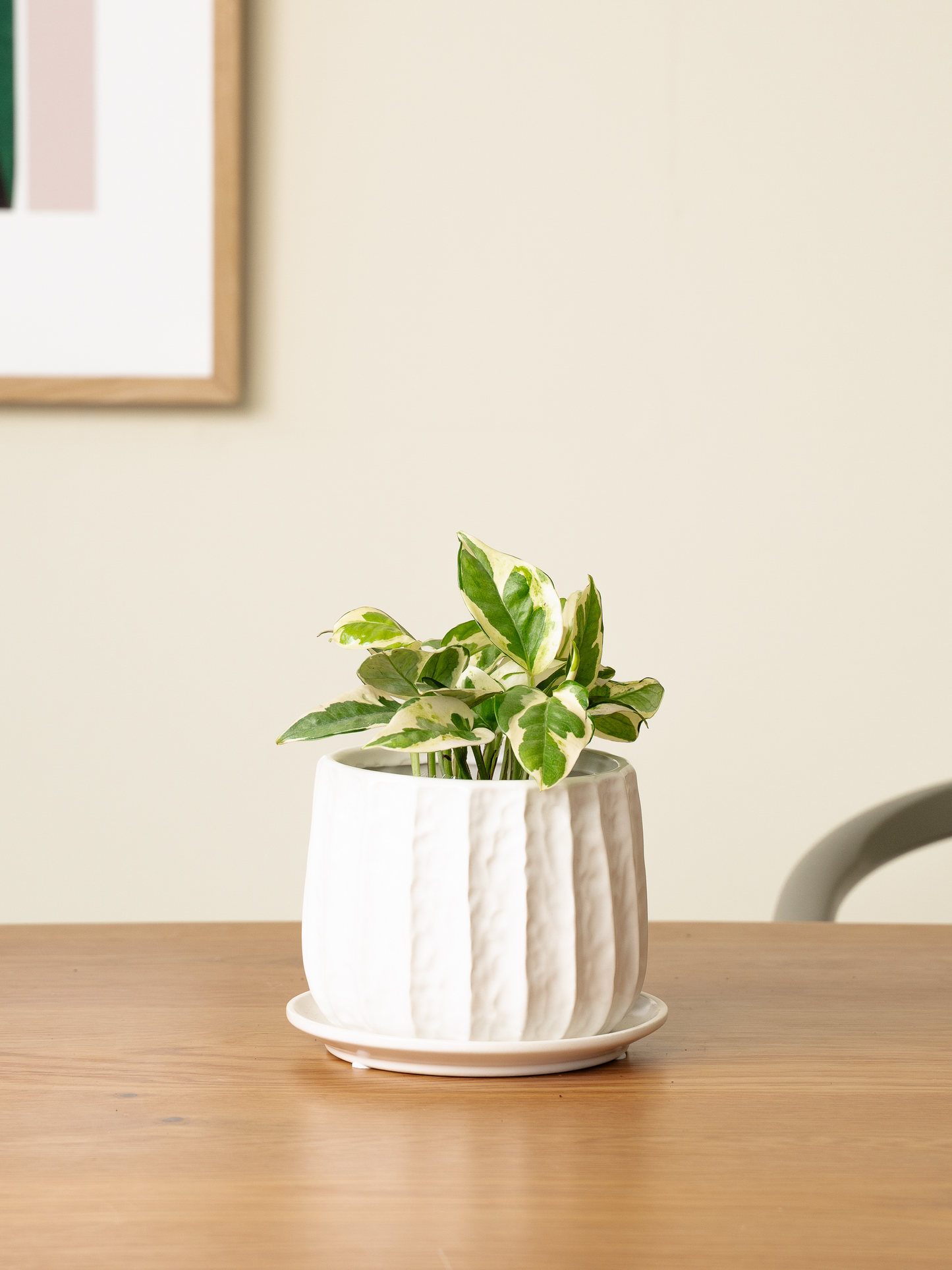 ポトスエンジョイは緑と白のコントラストが美しい観葉植物です。茎が伸びて垂れ下がってくるので、シェルフなどに高い場所に置いて飾ることをおすすめします。
