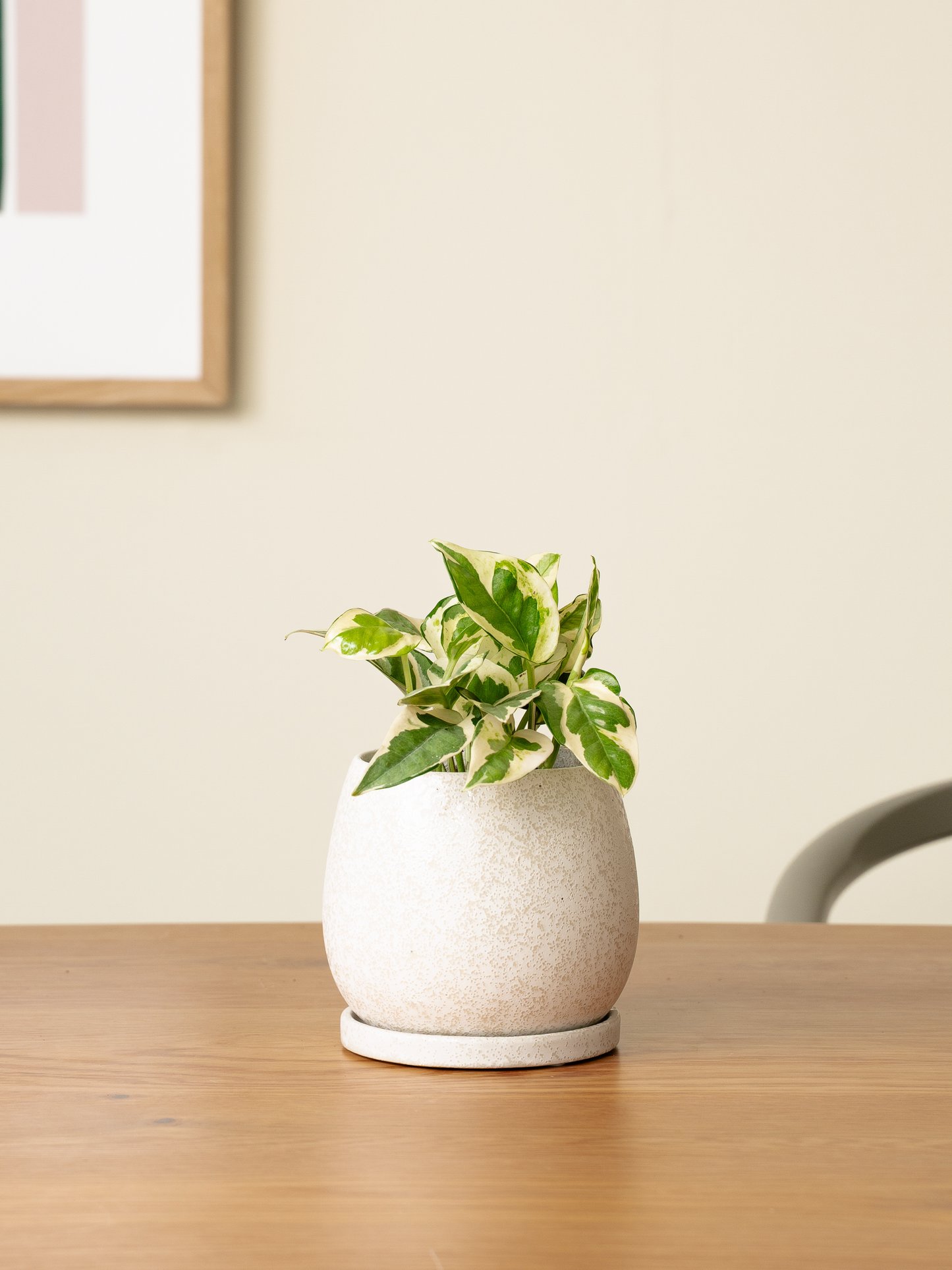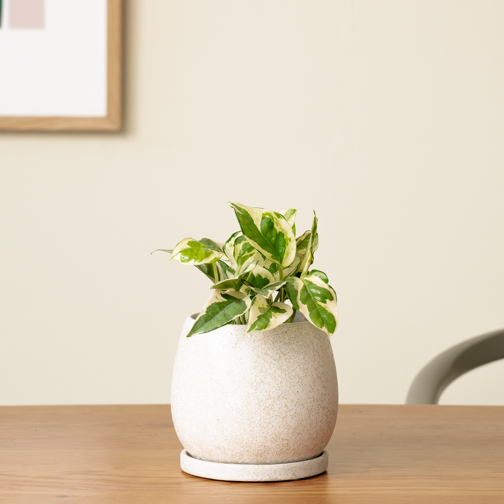 ポトスエンジョイは緑と白のコントラストが美しい観葉植物です。茎が伸びて垂れ下がってくるので、シェルフなどに高い場所に置いて飾ることをおすすめします。