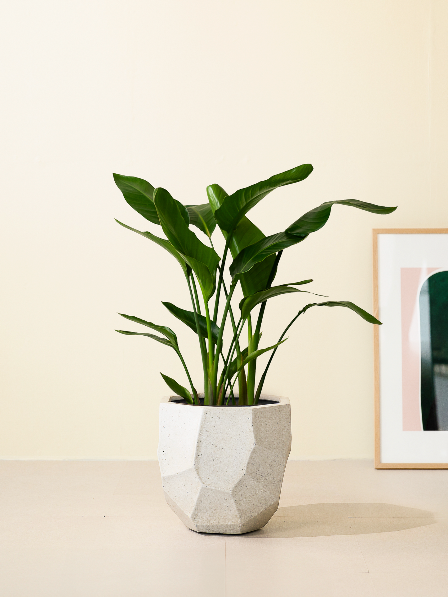 オーガスタは大きな葉が放射状に広がる、光沢のある葉が特徴的な観葉植物です。リゾート感がある植物なので、アジアンテイストやホテルライクなお部屋とよく合います。